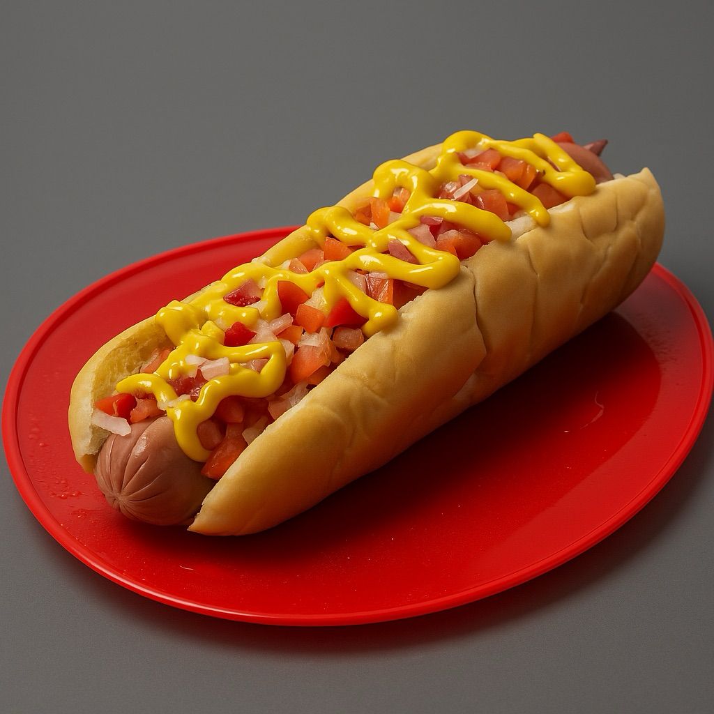 Salchicha de pavo jumbo, cebolla, jitomate y aderezos.