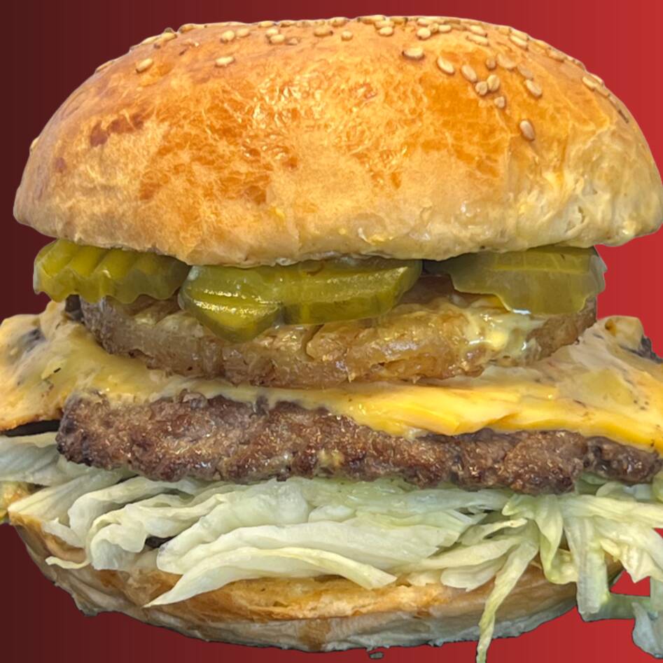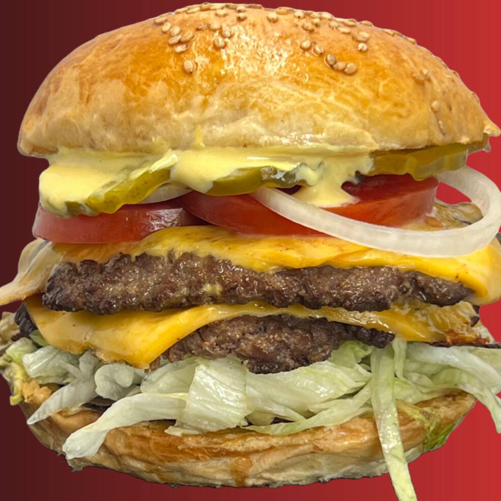 PARA EL ANTOJO SERIO. Disfruta de DOBLE carne de res jugosa y DOBLE capa de queso americano fundido. Con jitomate, cebolla, lechuga y pepinillos para equilibrar.