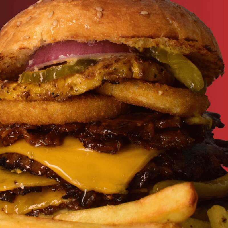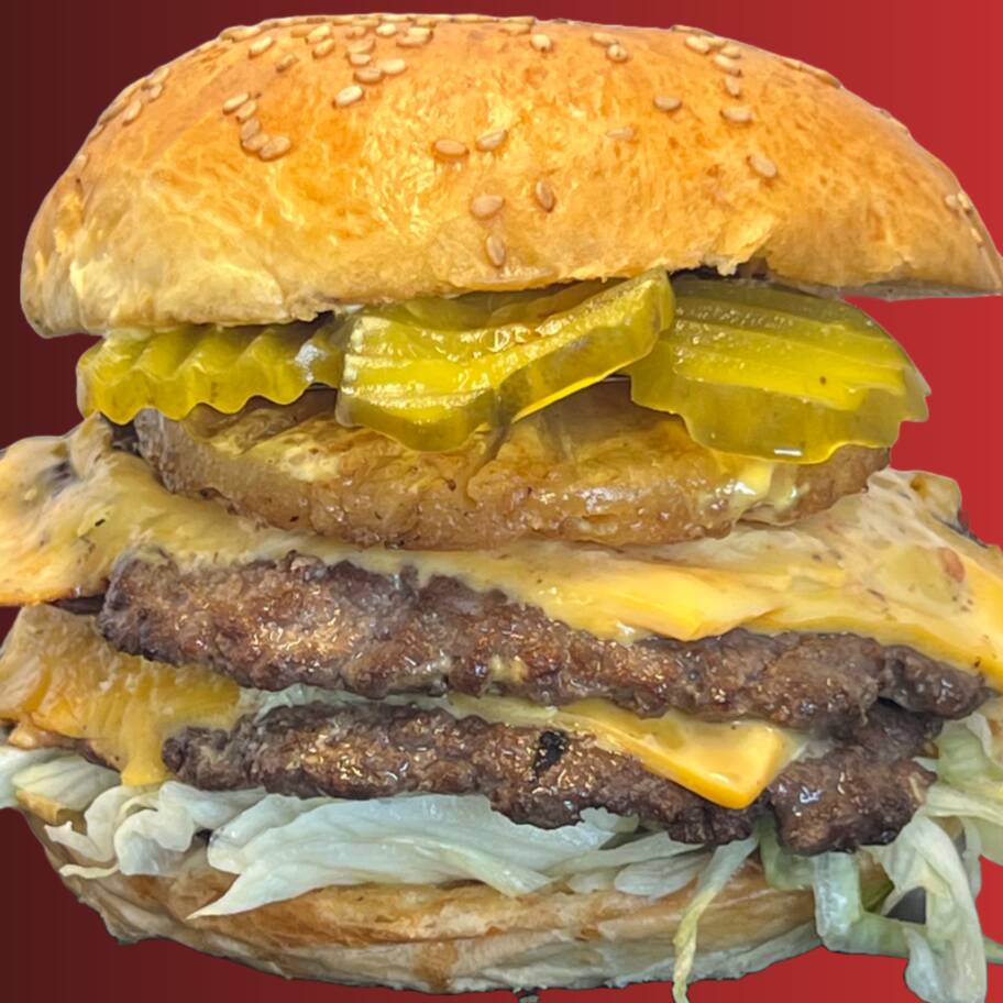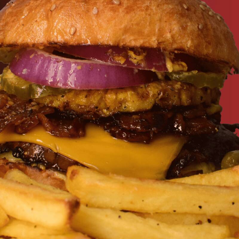 DOBLE CARNE + PIÑA ASADA + MERMELADA DE TOCINO. ¿Tienes hambre? Dos carnes, doble queso y el toque único de nuestra piña al grill y tocino dulce. Acompañada de cebolla morada y pepinillos.