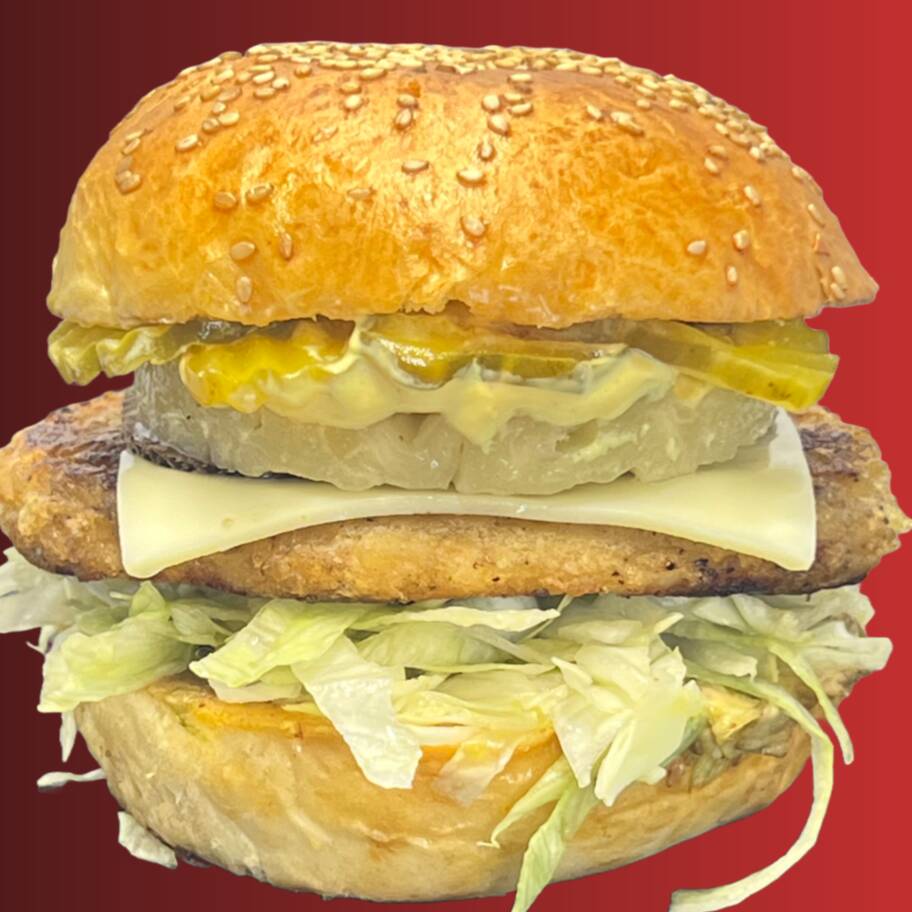 El doble de sabor con dos carnes, doble queso y el toque caramelizado de la piña al grill. Servida con cebolla morada, lechuga y pepinillos crujientes.