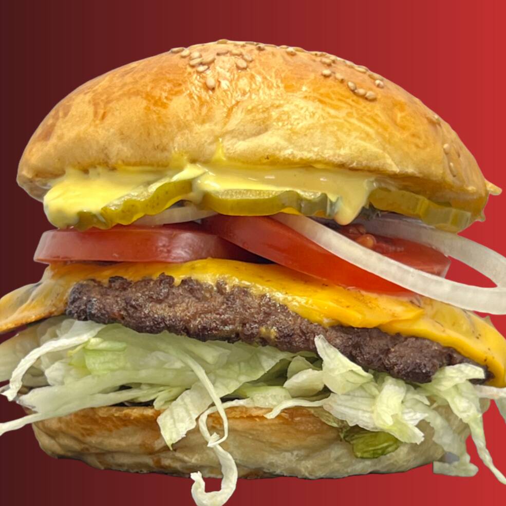 EL SABOR QUE NUNCA FALLA. Carne de res estilo smash y Queso Americano fundido. El equilibrio perfecto con jitomate, cebolla, lechuga fresca y el toque ácido de los pepinillos. Un clásico bien hecho.