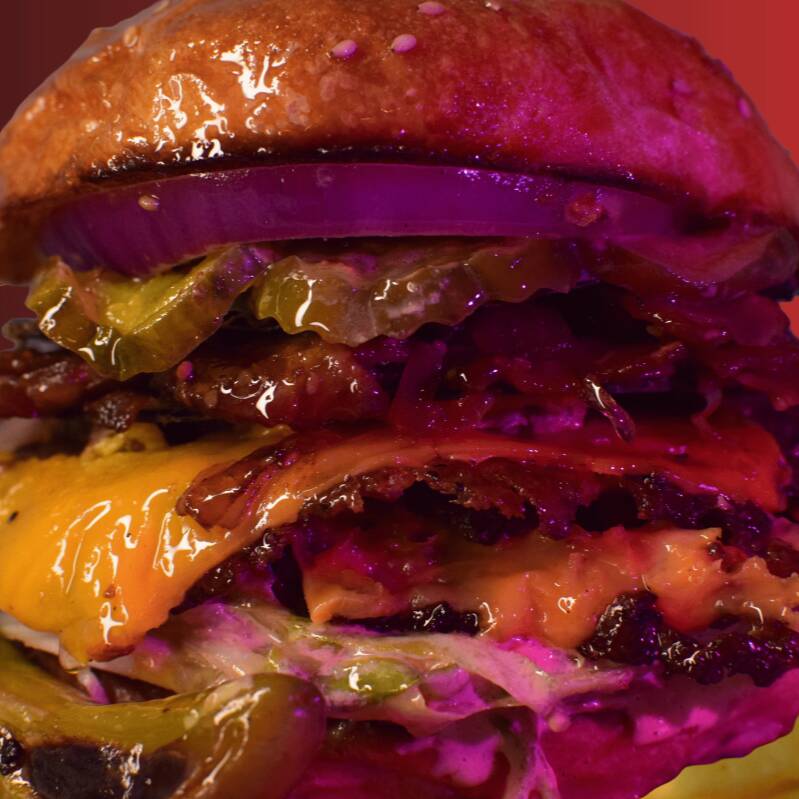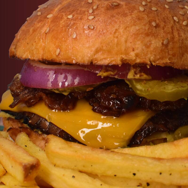Dos jugosas carnes de res bañadas en nuestra Mermelada de Tocino Artesanal (Receta de la Casa), fundidas en doble queso americano, con el toque fresco de cebolla morada, lechuga y pepinillos. (incluye porción personal de papas) ¡Imperdible!