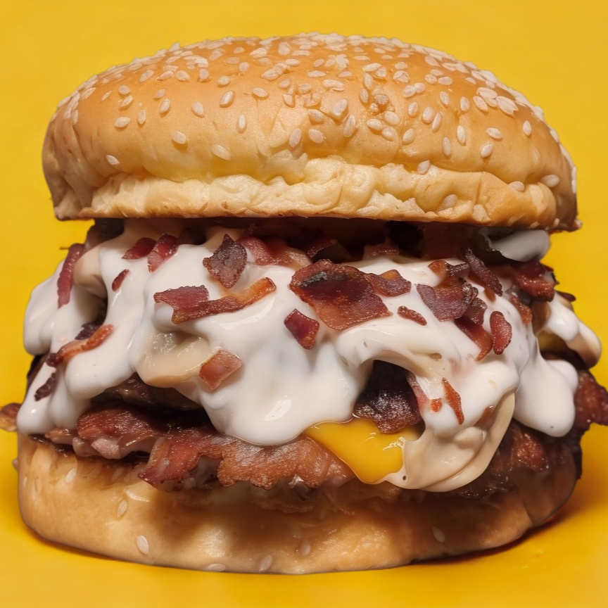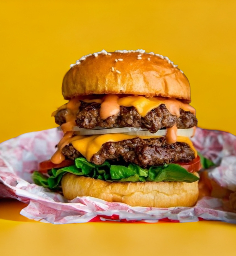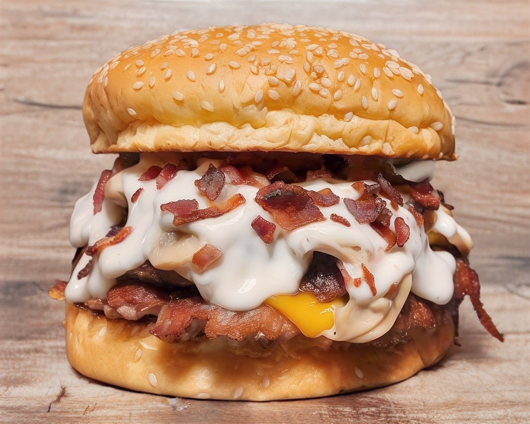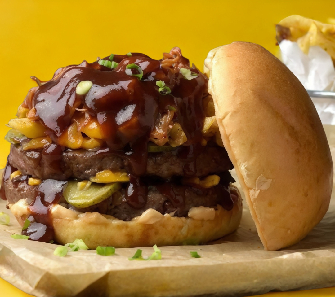 Doble carne con BBQ, tocino, cebolla caramelizada, lechuga, jitomate, queso amarillo, jamón, cebolla, salchicha, queso oaxaca y queso manchego.