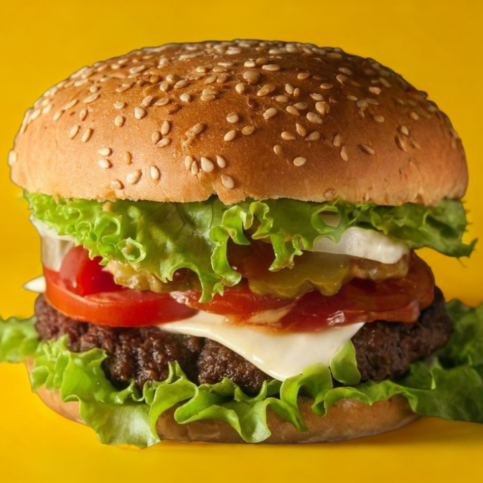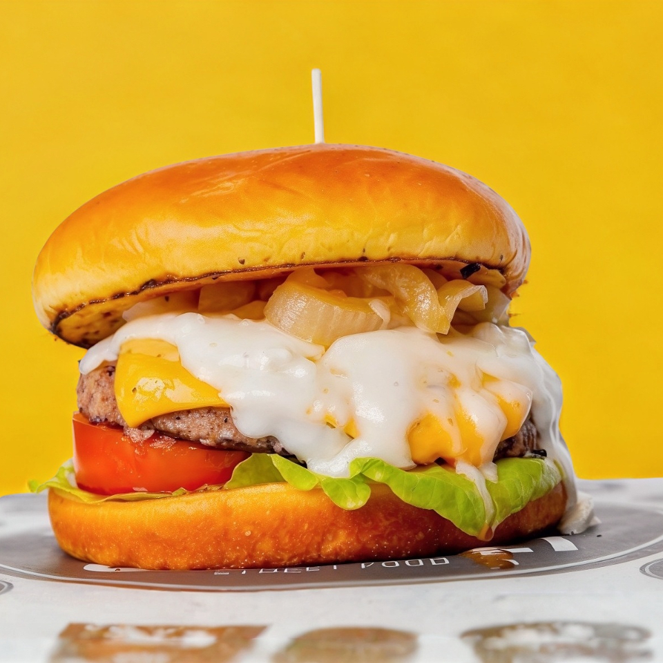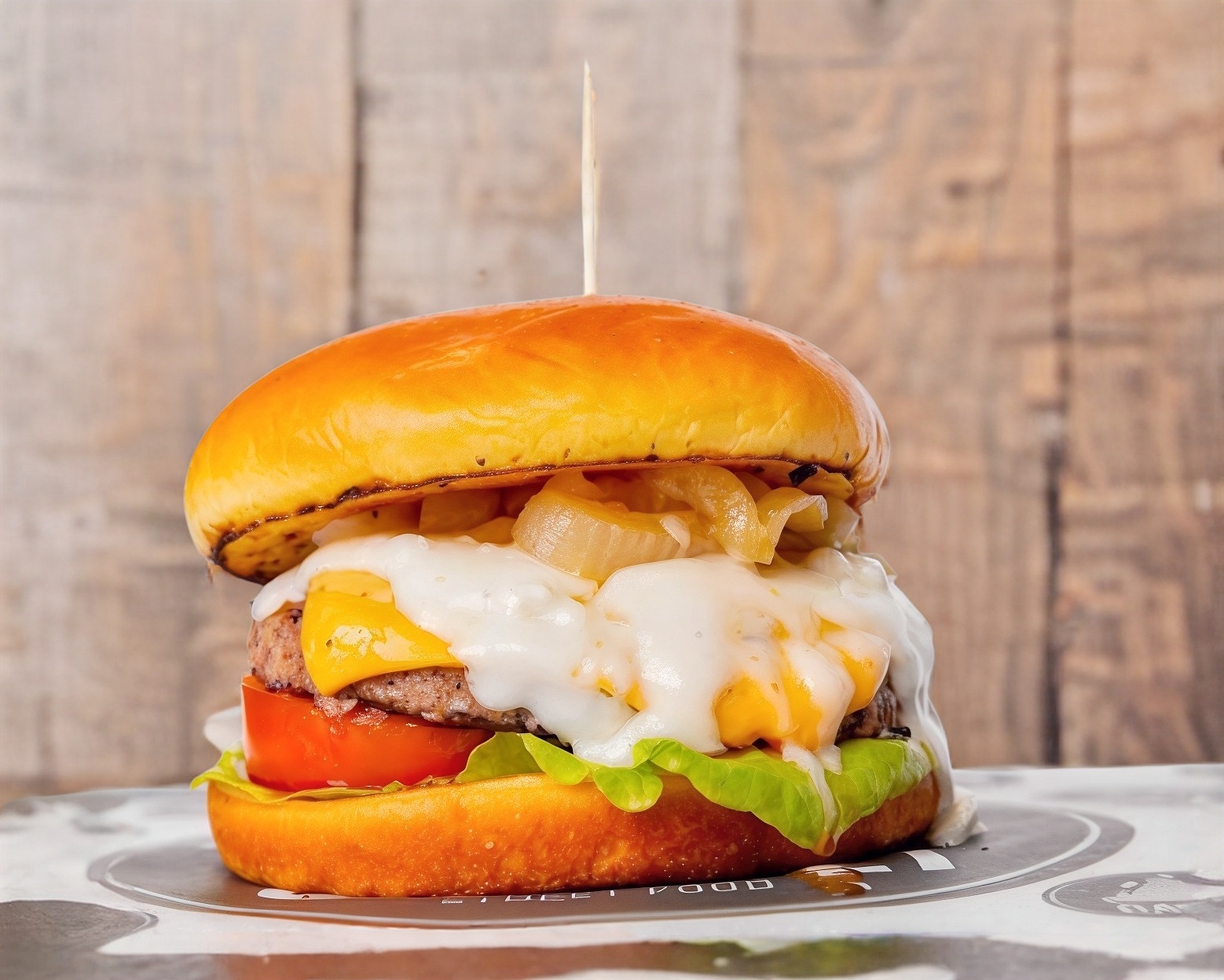 Doble carne con BBQ, tocino, cebolla caramelizada, lechuga, jitomate, queso amarillo, jamón, cebolla, salchicha, queso oaxaca y queso manchego.