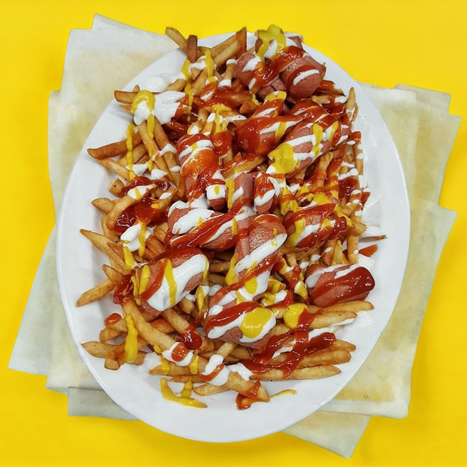 Chorizo, queso oaxaca, salchicha, verdura, aderezos.