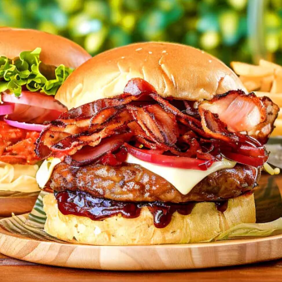 hamburguesa DE ARRACHERA CON CHORIZO y pastor : Medallón de carne sazonada con cebollitas caramelizadas acompañadas de queso amarillo, queso fundió Oaxaca, lechuga mas aderezos mayonesa cátsup y mostaza