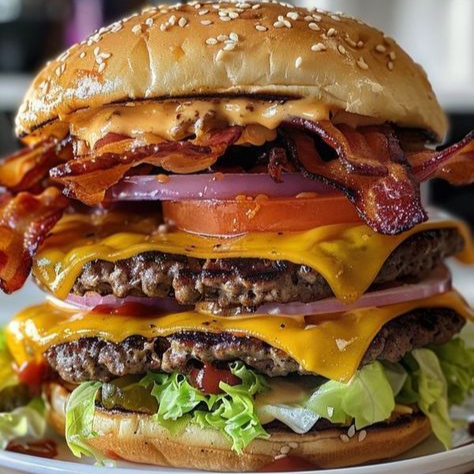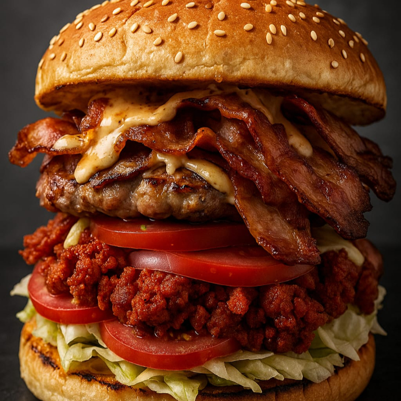 La verdadera tapa arterias ,una torre de cuatro carnes todas bañadas en queso americano acompañadas de una corona de tocino bañada de aderezos y salsa BBQ