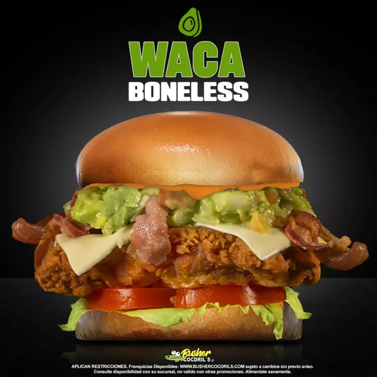 Pechuga de pollo empanizada crujiente (145 g en crudo), aderezo spicy dip monsta, lechuga, tomate, guacamole, queso manchego y tocino.