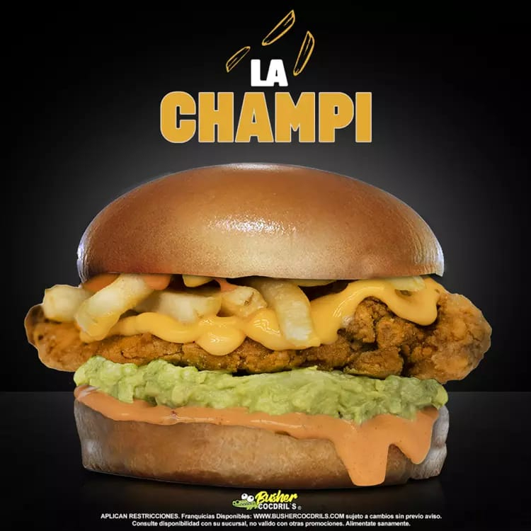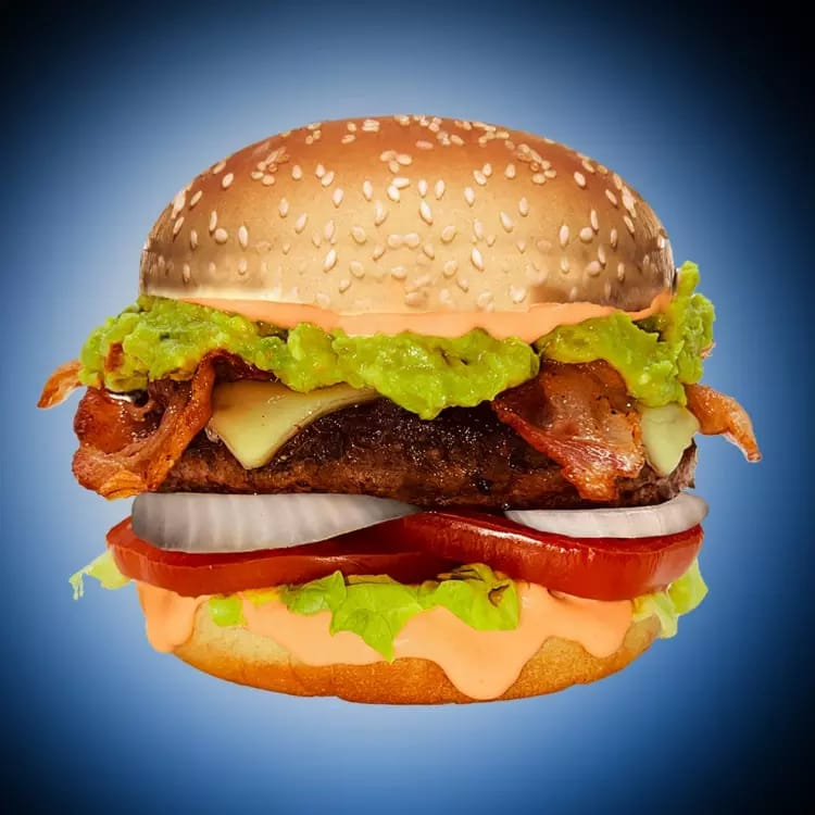 Aderezo animal style, guacamole, tocino, queso manchego, carne de res, cebolla tomate y lechuga.