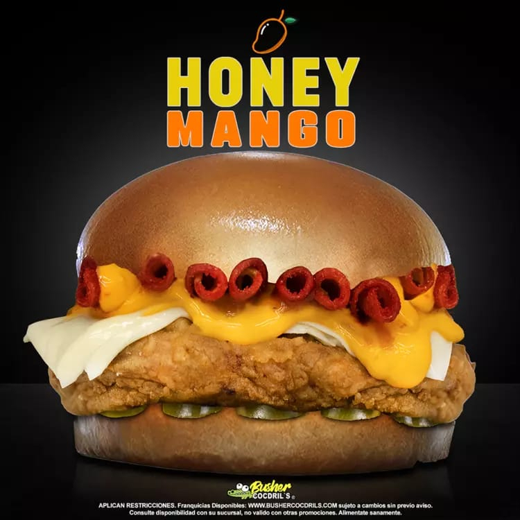 Pechuga de pollo empanizada crujiente (145 g en crudo), sweet habanero mango, queso manchego, cheese dip, jalapeños y Takis fuego.