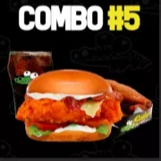 Pechuga de pollo empanizada crujiente (145 g en crudo), honey sauce hot bbq, cheese dip, tocino y aros de cebolla.