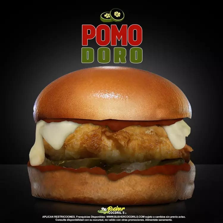Pechuga de pollo empanizada crujiente (145 g en crudo) aderezo pomodoro, queso gratinado y pepinillos.