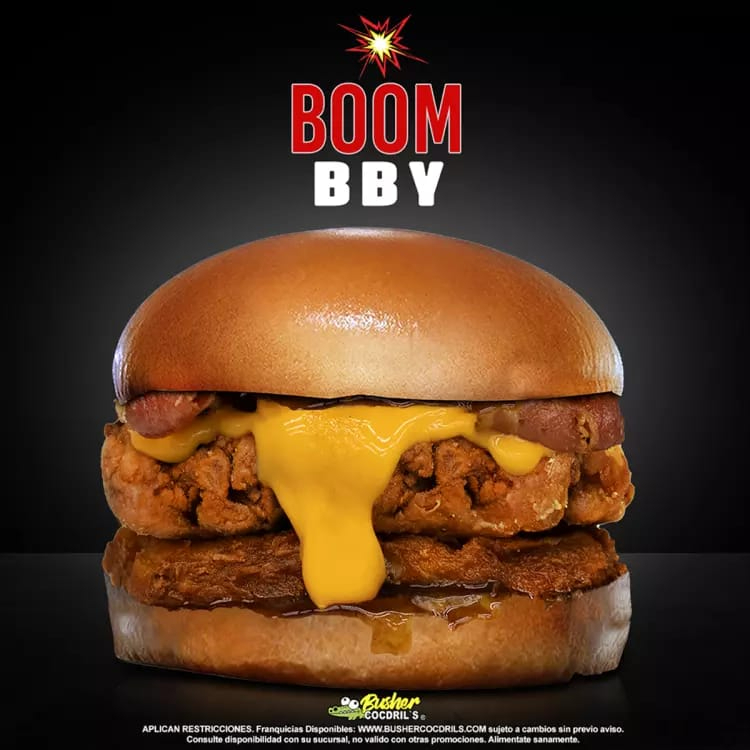 Pechuga de pollo empanizada crujiente (145 g en crudo), aderezo spicy dip monsta, jalapeños en escabeche, queso manchego, tocino, dedos de queso y salsa cheese dip.