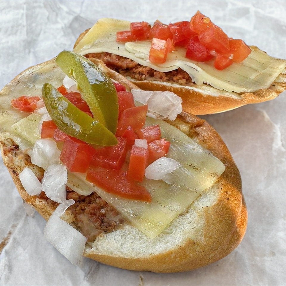 Orden de 2 molletes con frijoles, cochinita y queso manchego.