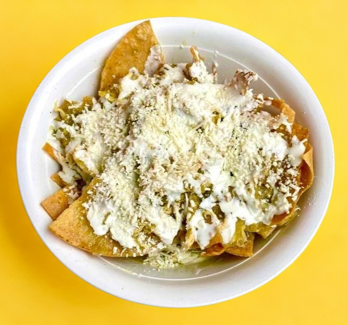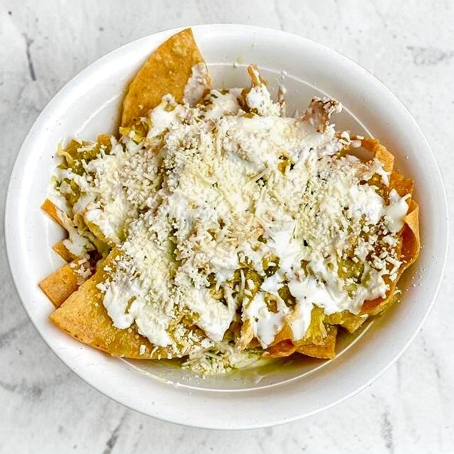 Orden de chilaquiles verdes con pollo, queso, cebolla y crema
