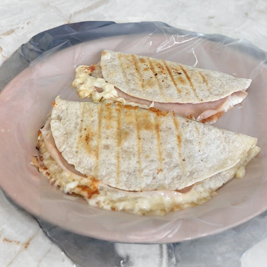 Orden de 2 quesadillas hechas con tortilla de harina, jamón de pechuga de pavo y queso manchego.