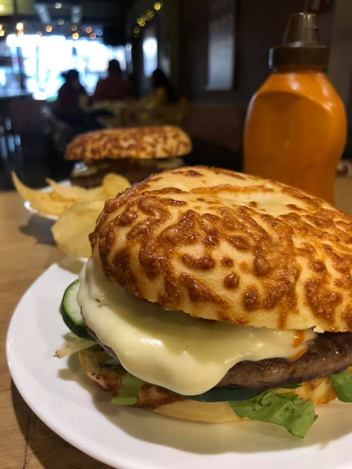 Carne de arrachera (tipo hamburguesa), camarones gratinados con queso manchego, lechuga, pepinos y salsa chipotle.