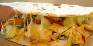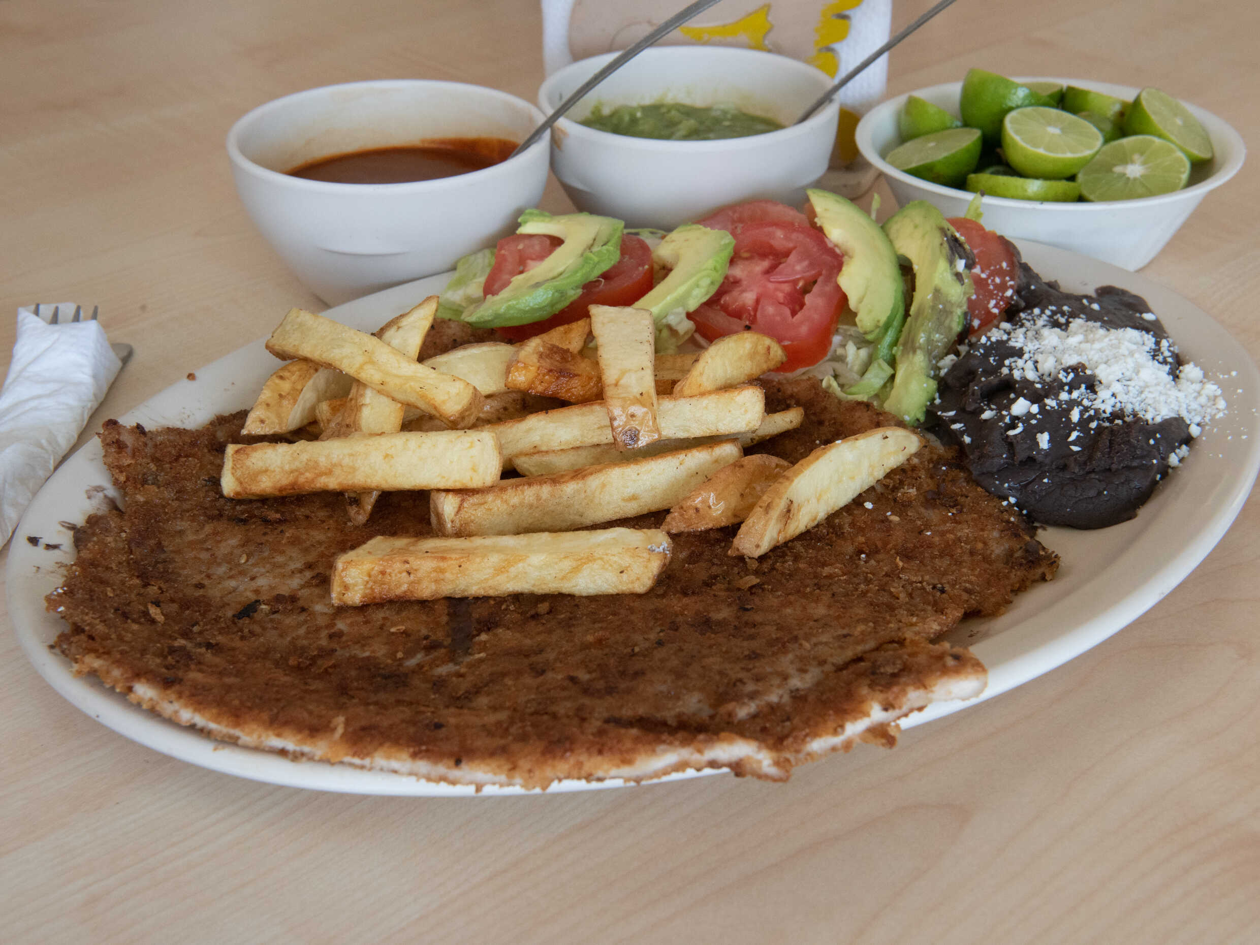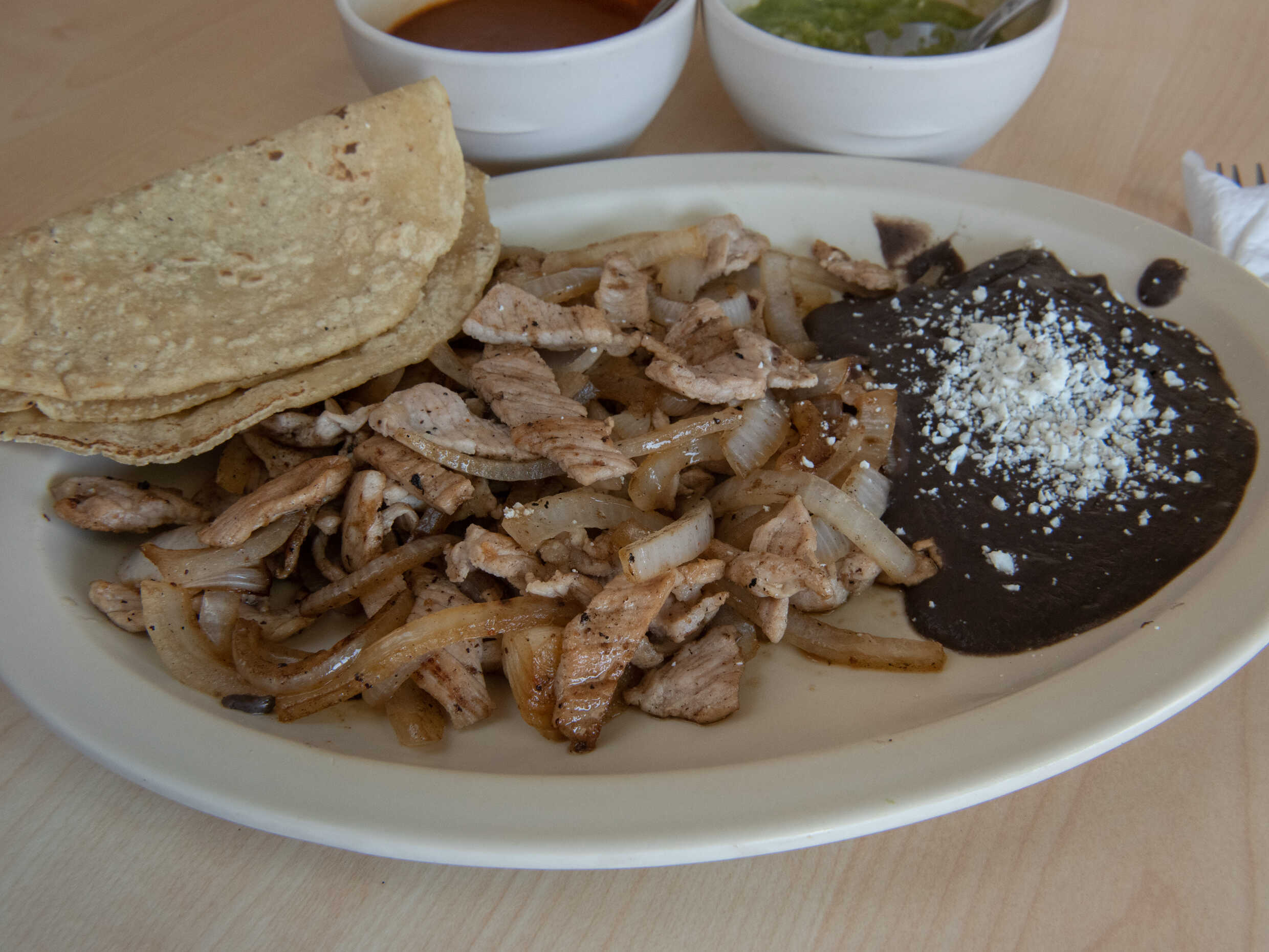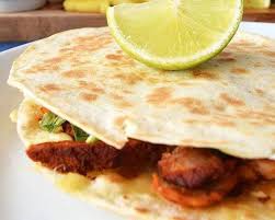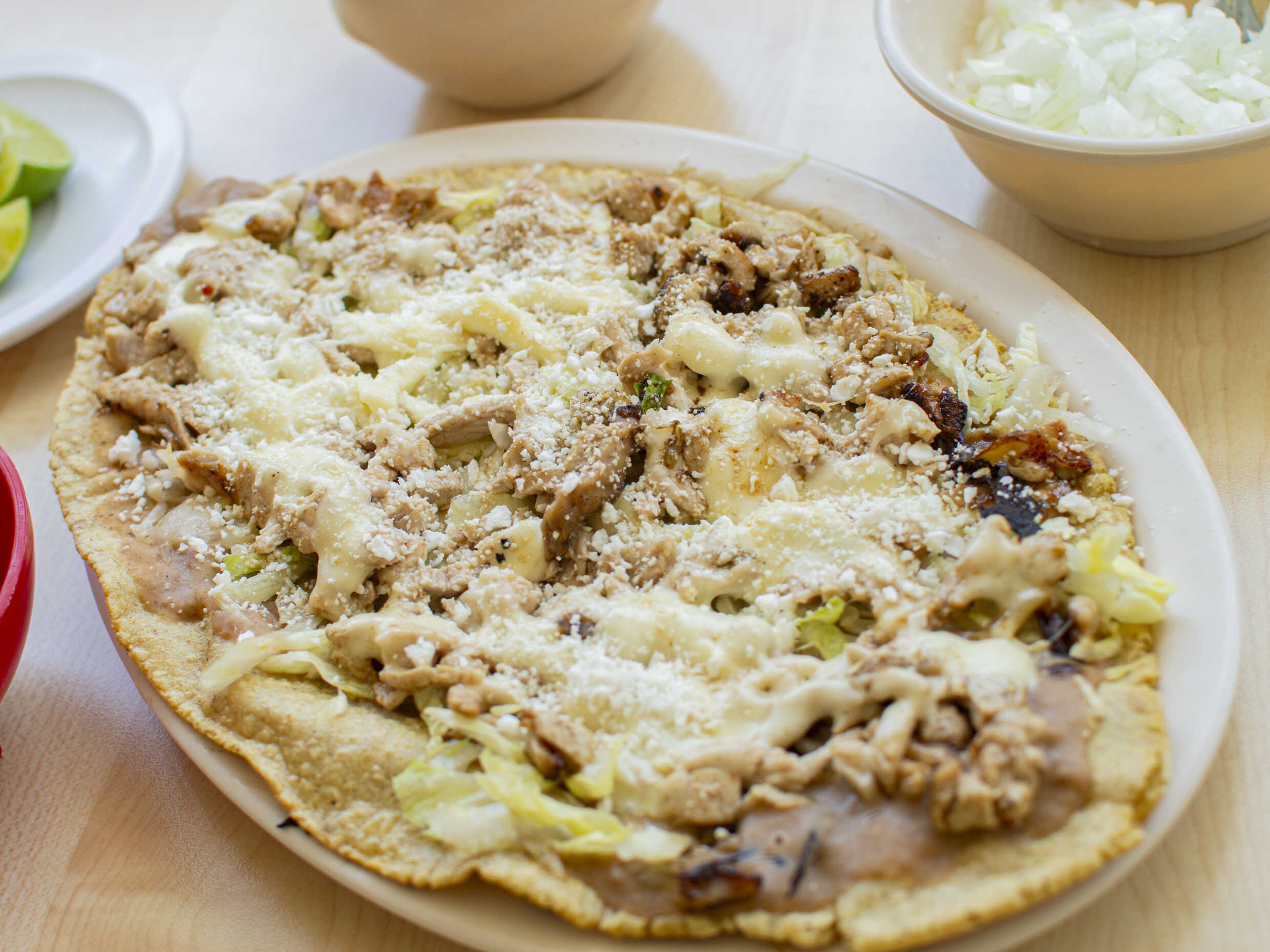 4 tortillas hechas a mano bañadas en rico mole rojo ya sea con bisteck o pollo. Con crema y queso molido.