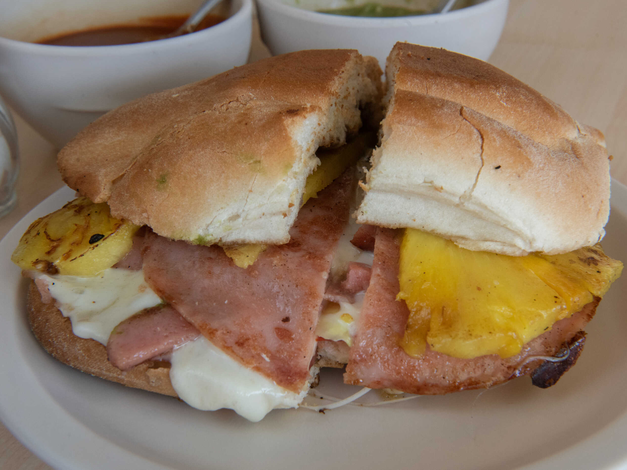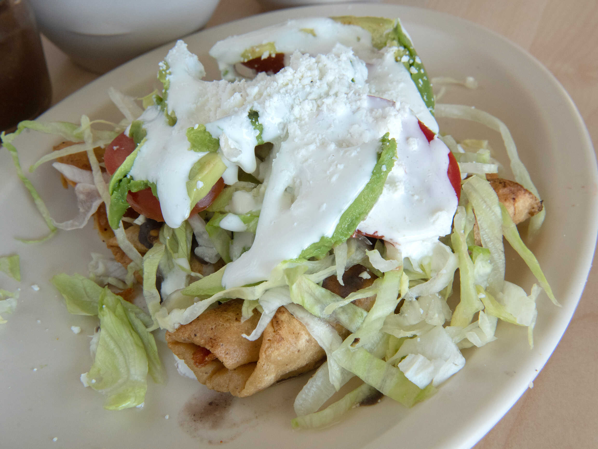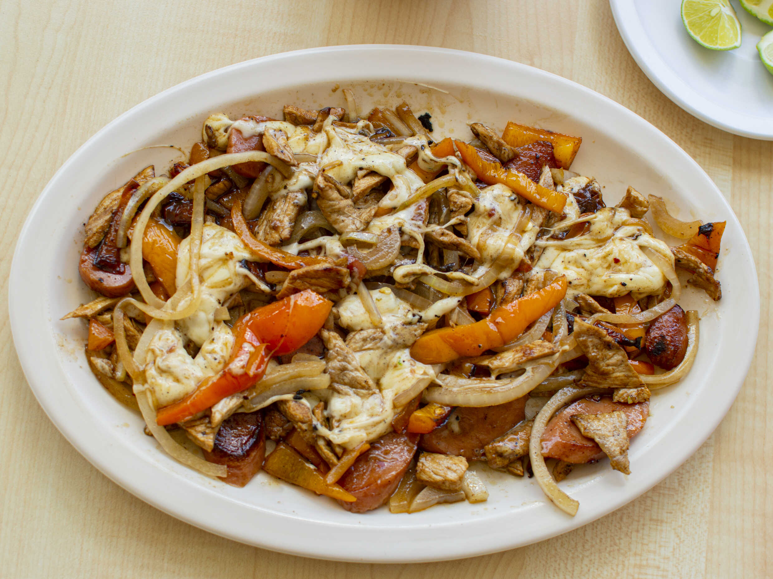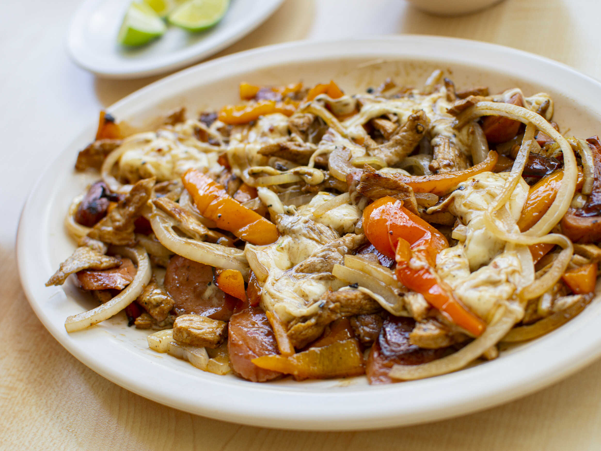 Frijoles, lechuga, queso rayado, bistec, pimiento, cebolla, salchicha, queso oaxaca