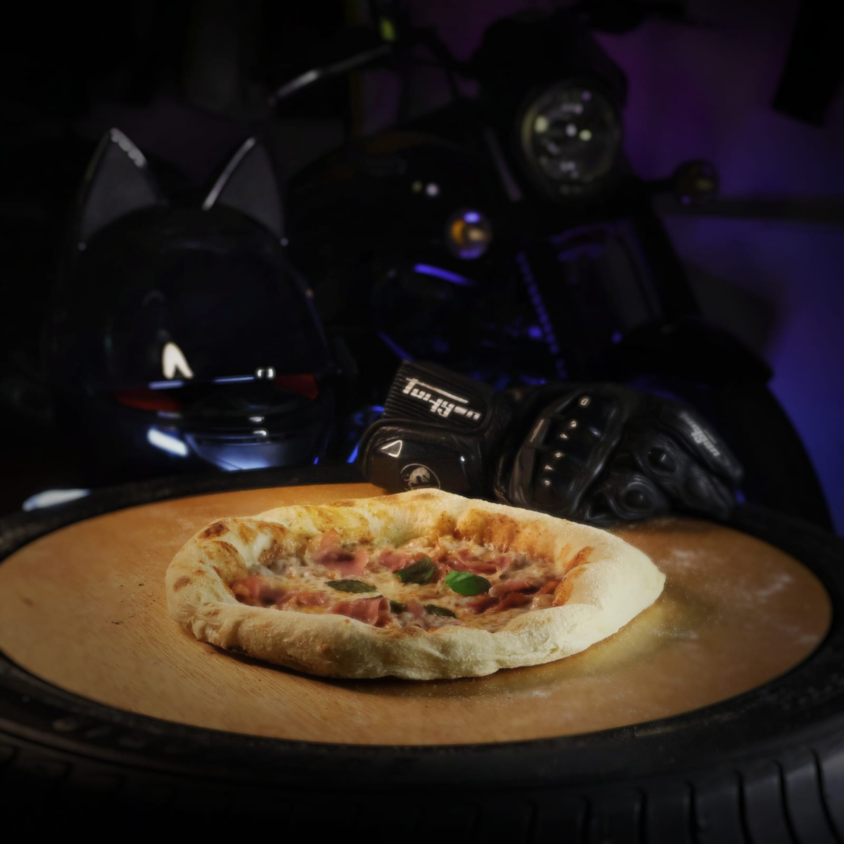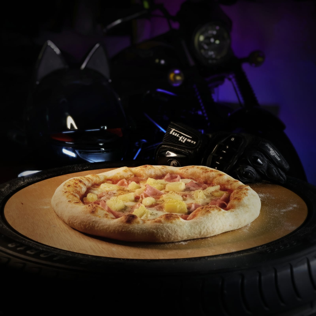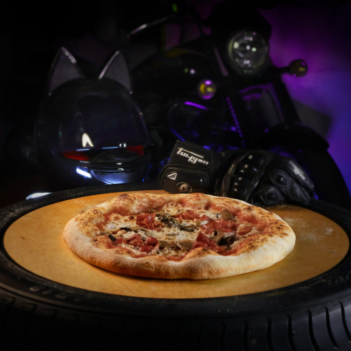 Deliciosa pizza de 30cm tipo napolitana, elaborada con tocino crujiente, champiñones, tomate y queso