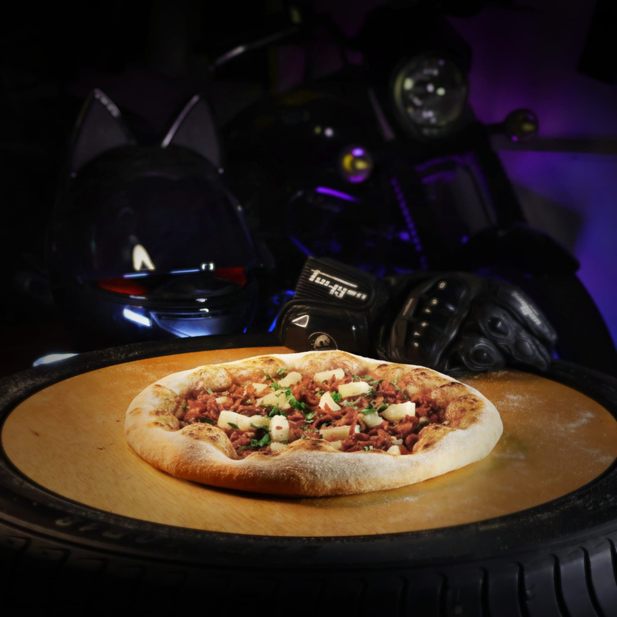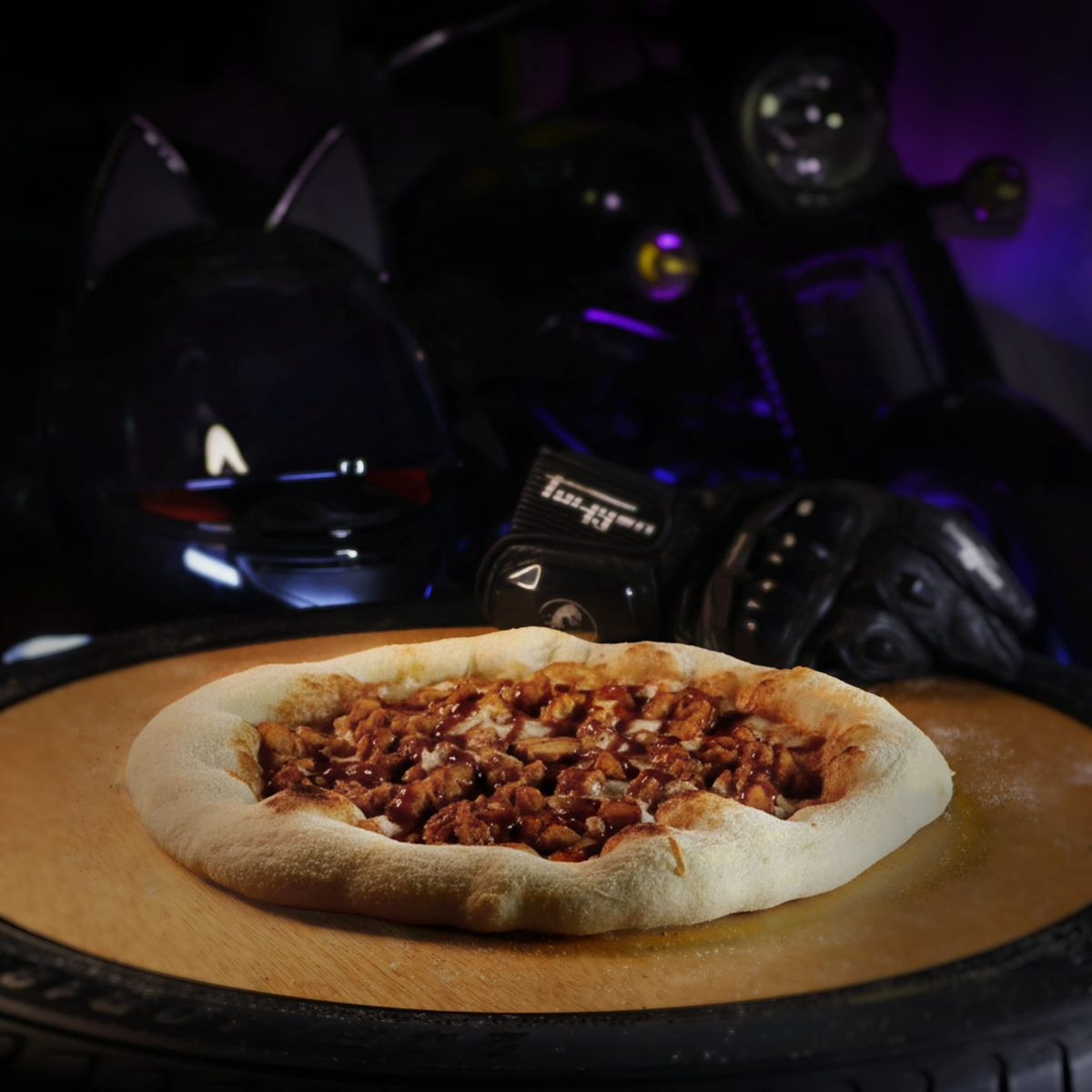 Pizza de 30cm con trocitos de pollo, cebolla caramelizada y salsa BBQ