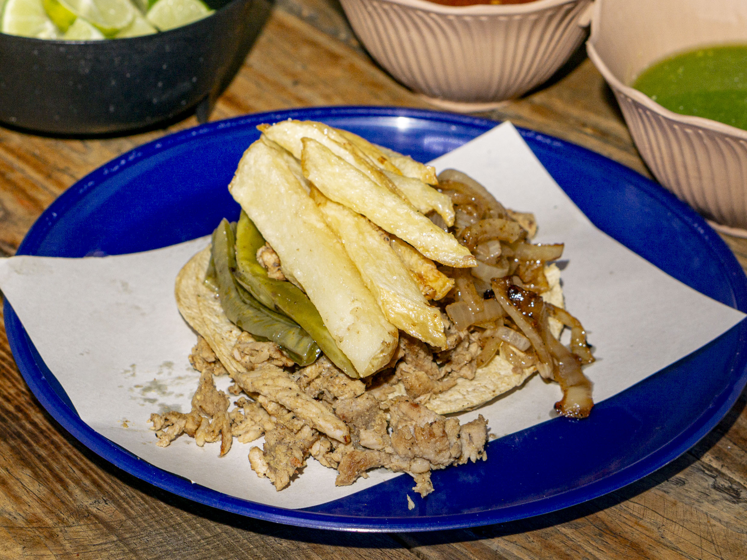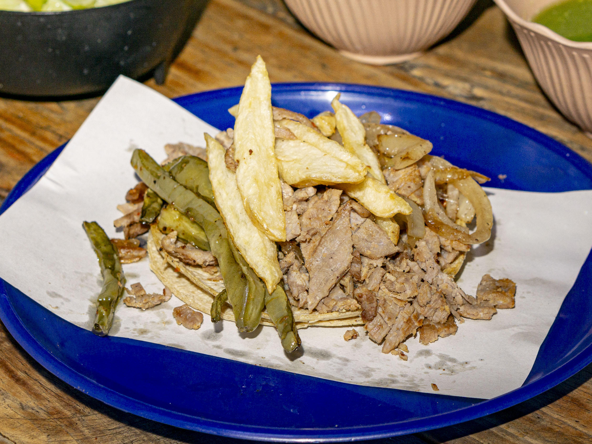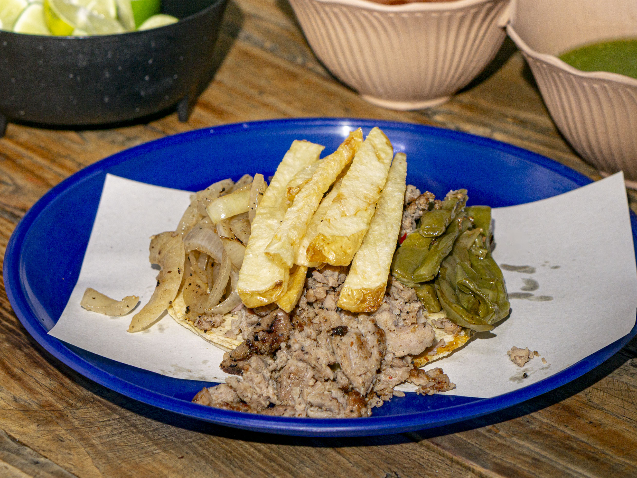 tus tacos van acompañados de cebollas caramelizadas, nopales y papas a la francesa con tortilla de maiz.
