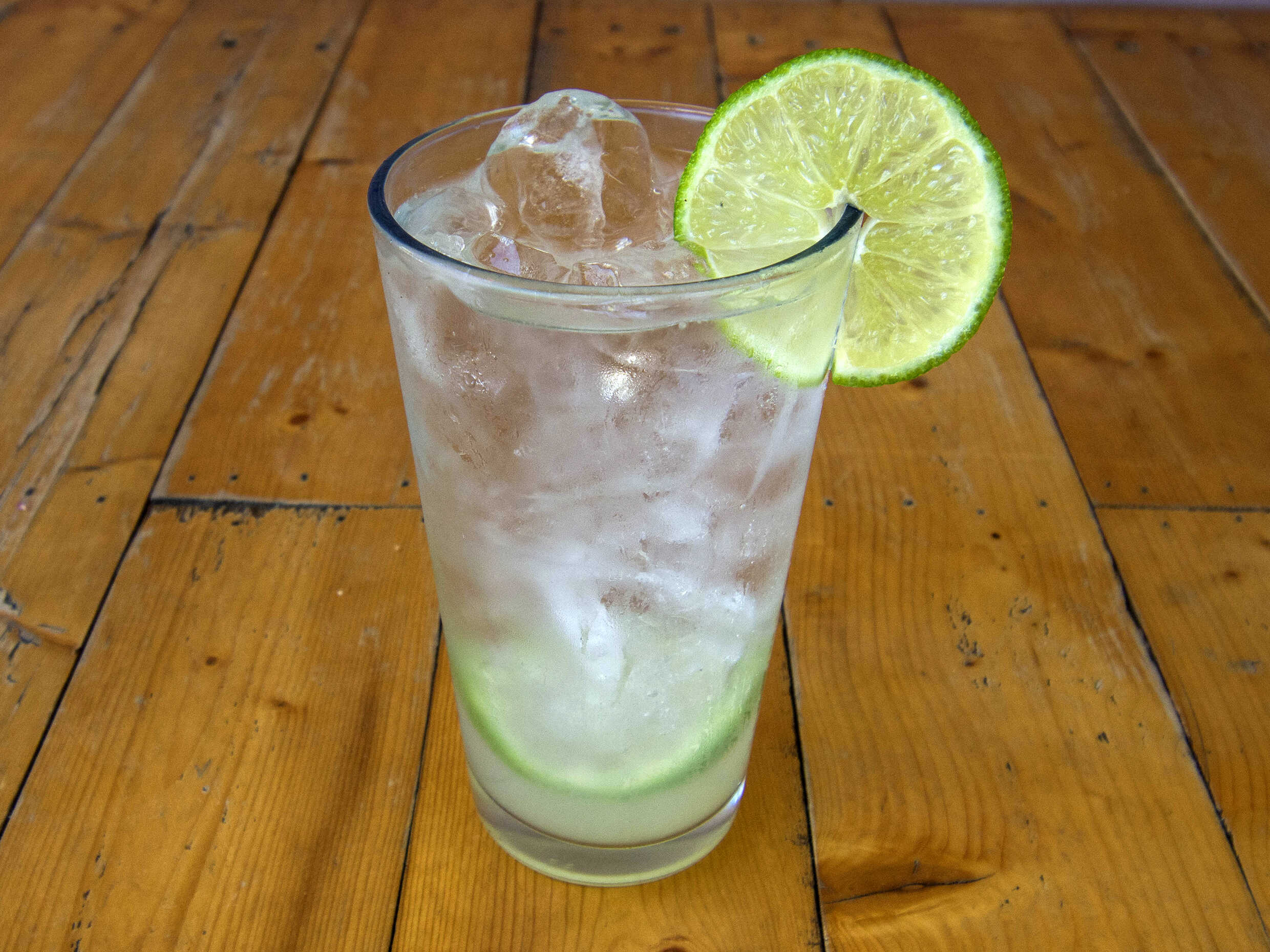 Recién exprimido jugo de limón, hielo, agua gasificada endulzada con jarabe natural.