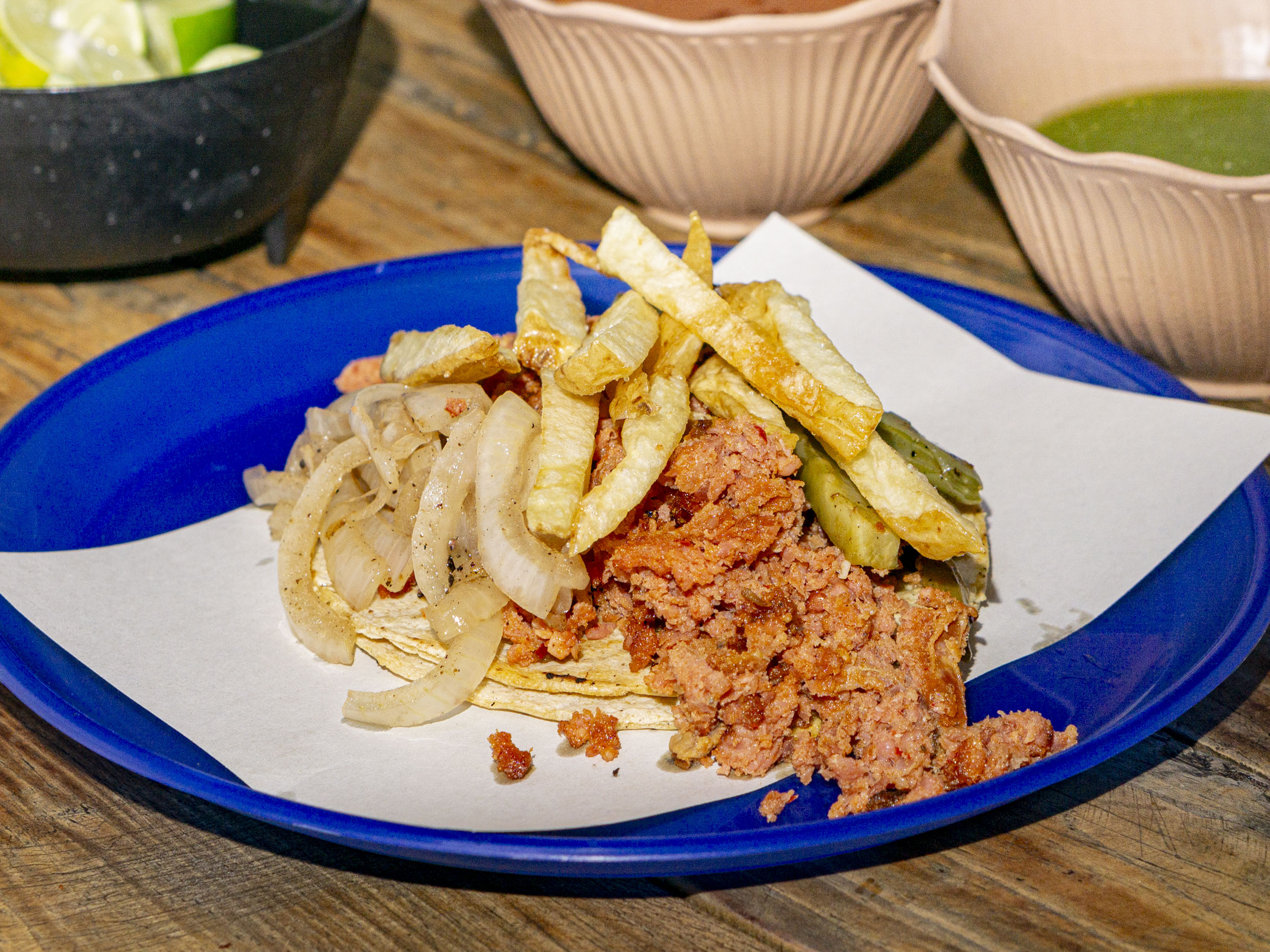 tus tacos van acompañados de cebollas caramelizadas, nopales y papas a la francesa con tortilla de maiz