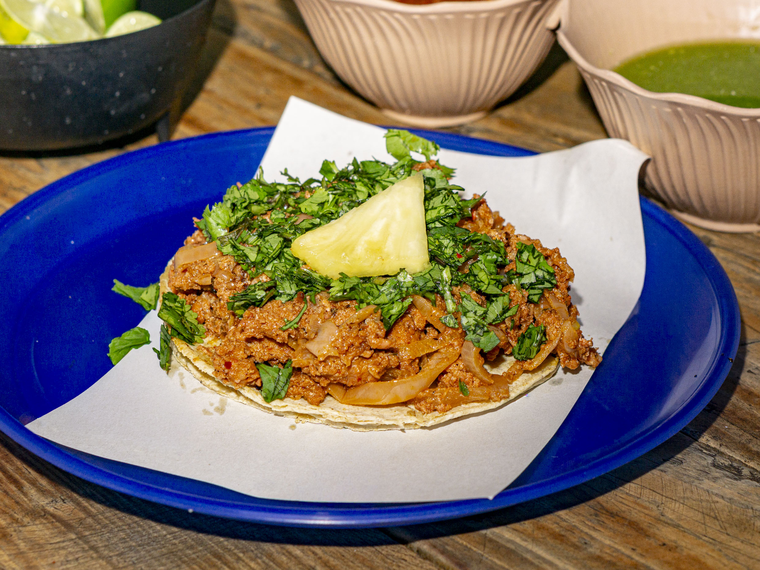 Tus tacos van acompañados de cebolla, cilantro y piña