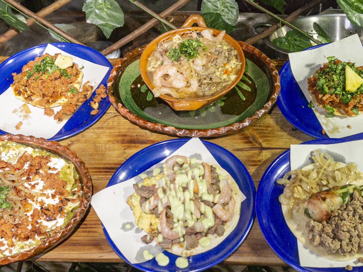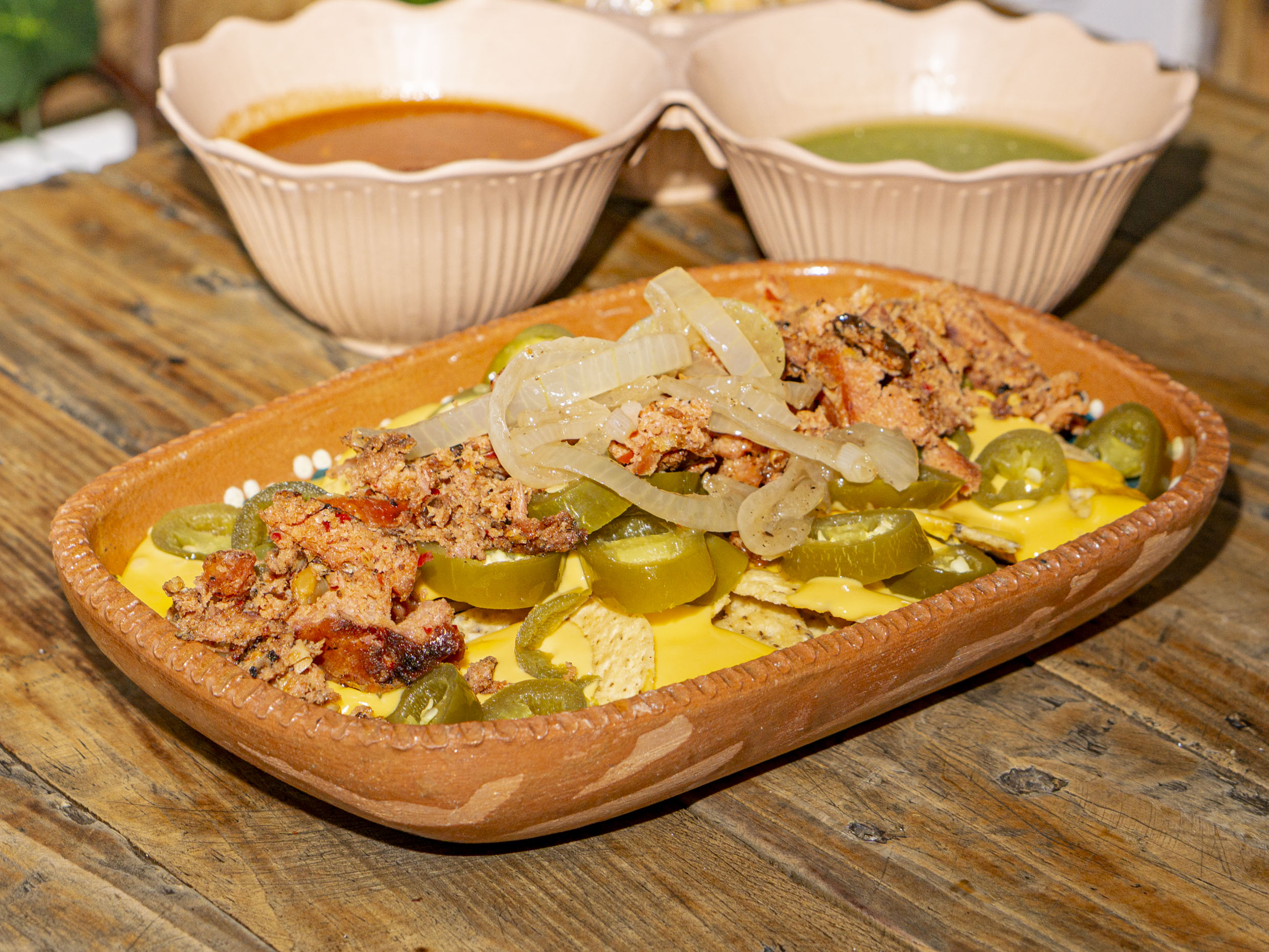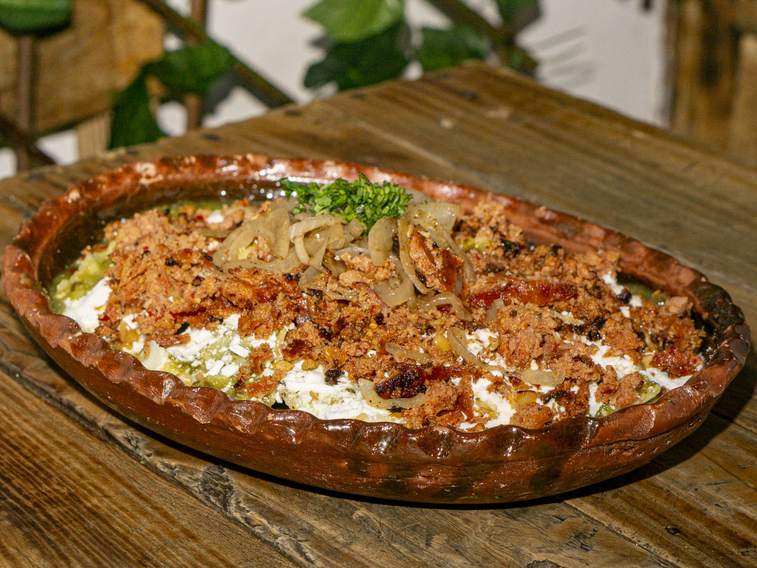 Queso menonita derretido montado sobre tortilla frita con una corona de carne campechano acompañado de cebollas caramelizadas y nopales asados.