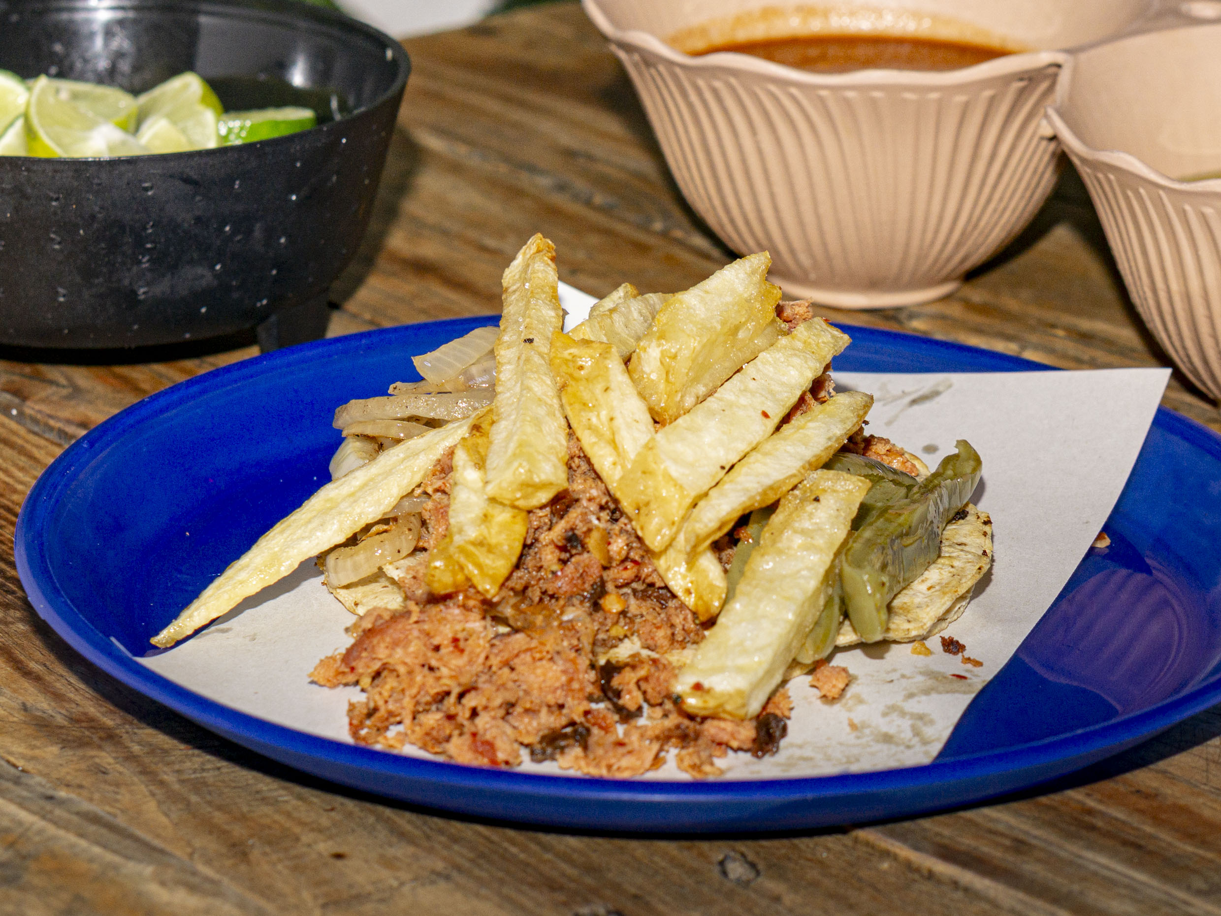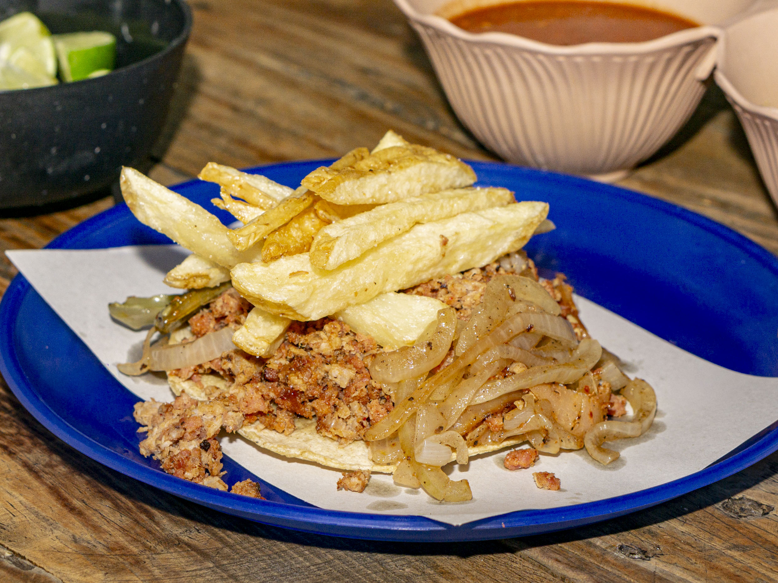 Tus tacos van acompañados con cebollas caramelizadas, nopales y papas a la francesa con tortilla de maiz