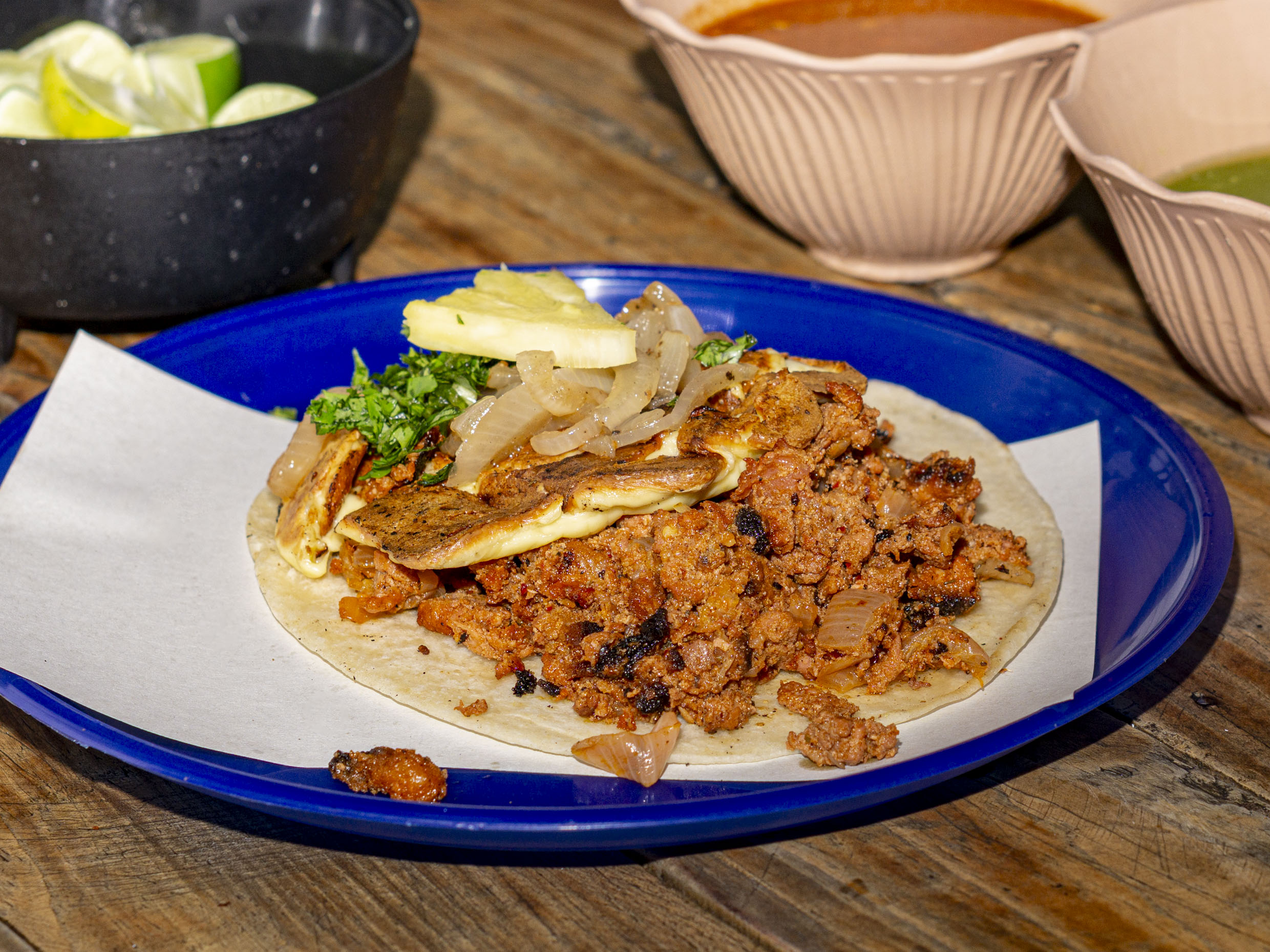 Costra de queso menonita doradita a la plancha acompañada de cebollas caramelizadas, cilantro y piña. en tortilla de harina y carne al pastor