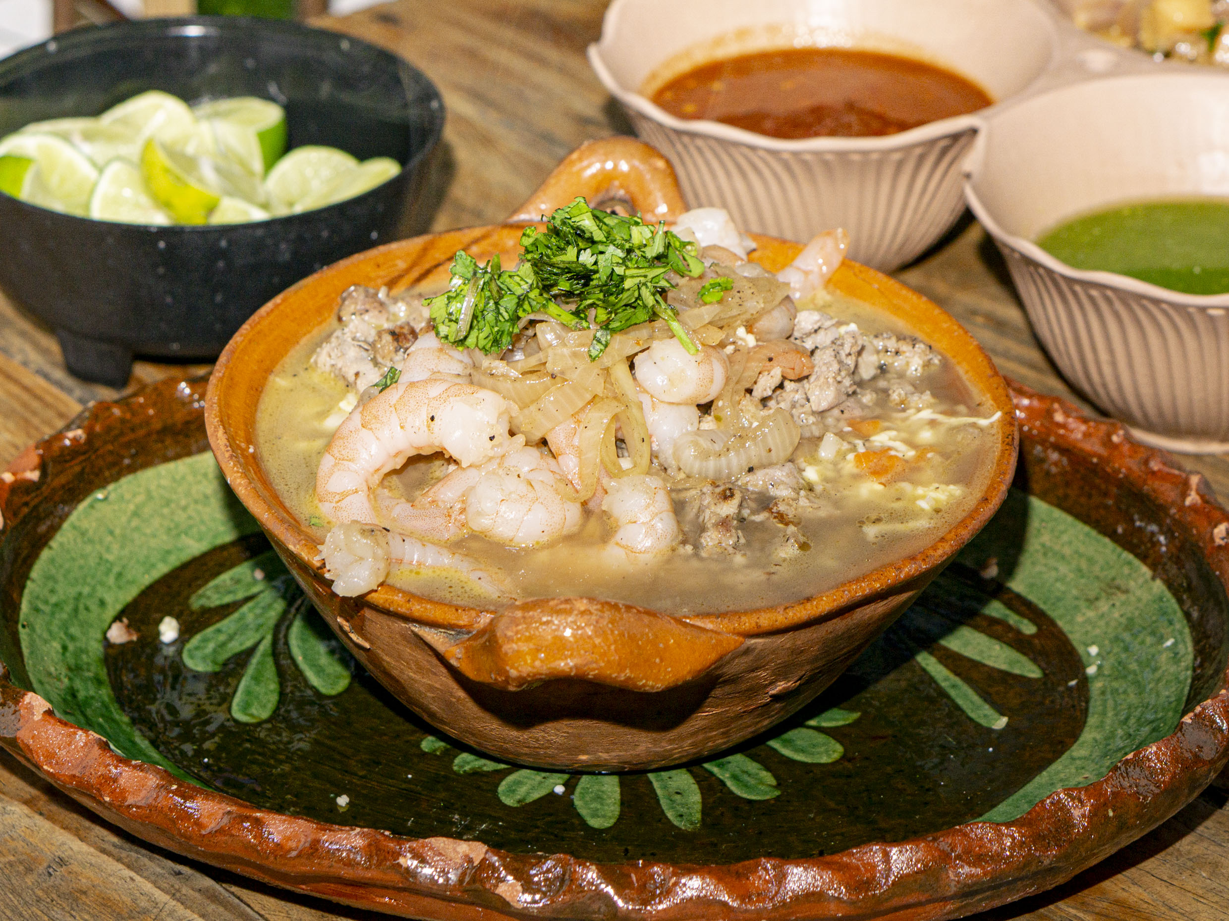 Camarón y arrachera a la parrilla montados sobre una costra de queso menonita con deliciosas cebollitas caramelizadas y una emulsión de guacamole..
