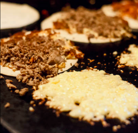 Queso menonita gratinado sobre tortilla frita con tu proteina favorita a la plancha acompañado de cebollas caramelizadas y nopales asados.