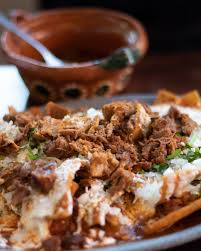 Totopos crujientes con carne de birria bañados en salsa de tu elección verde o roja.