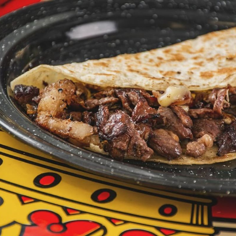 Taco gigante tortilla (maíz o harina) rellena con carne de birria y queso manchego.