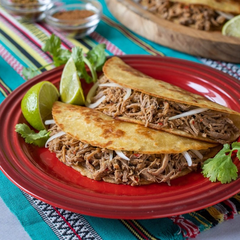 Tortilla (maíz o harina) rellena con carne de birria y queso manchego.