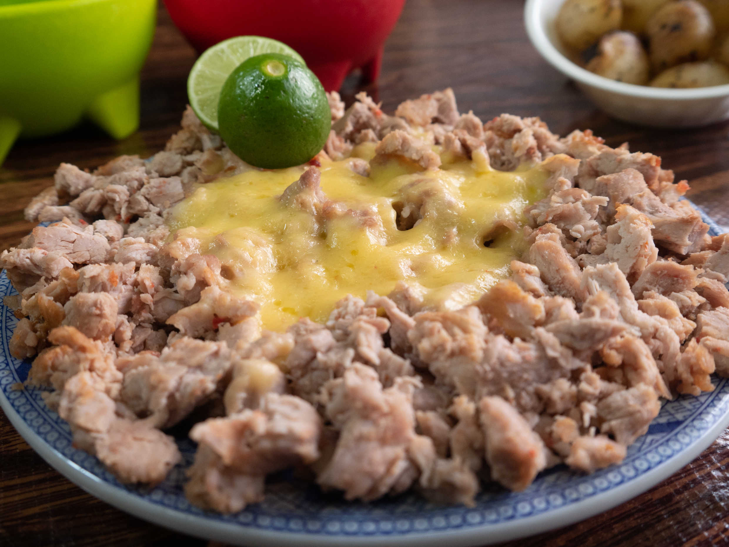 Carne de cerdo en adobo especial, incluye tortillas y limones.