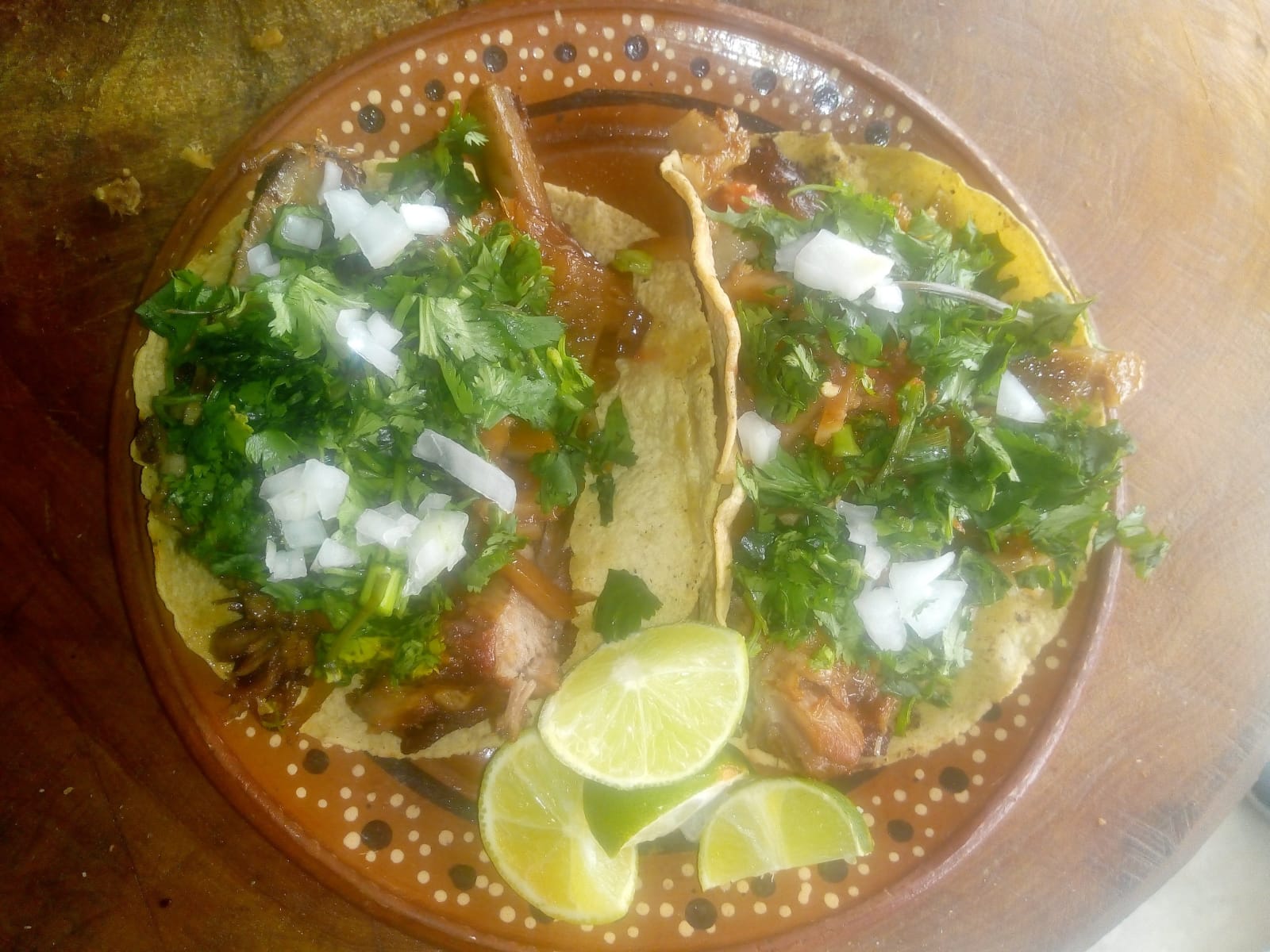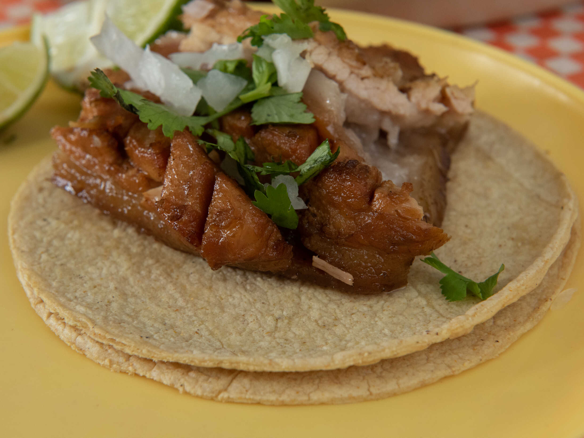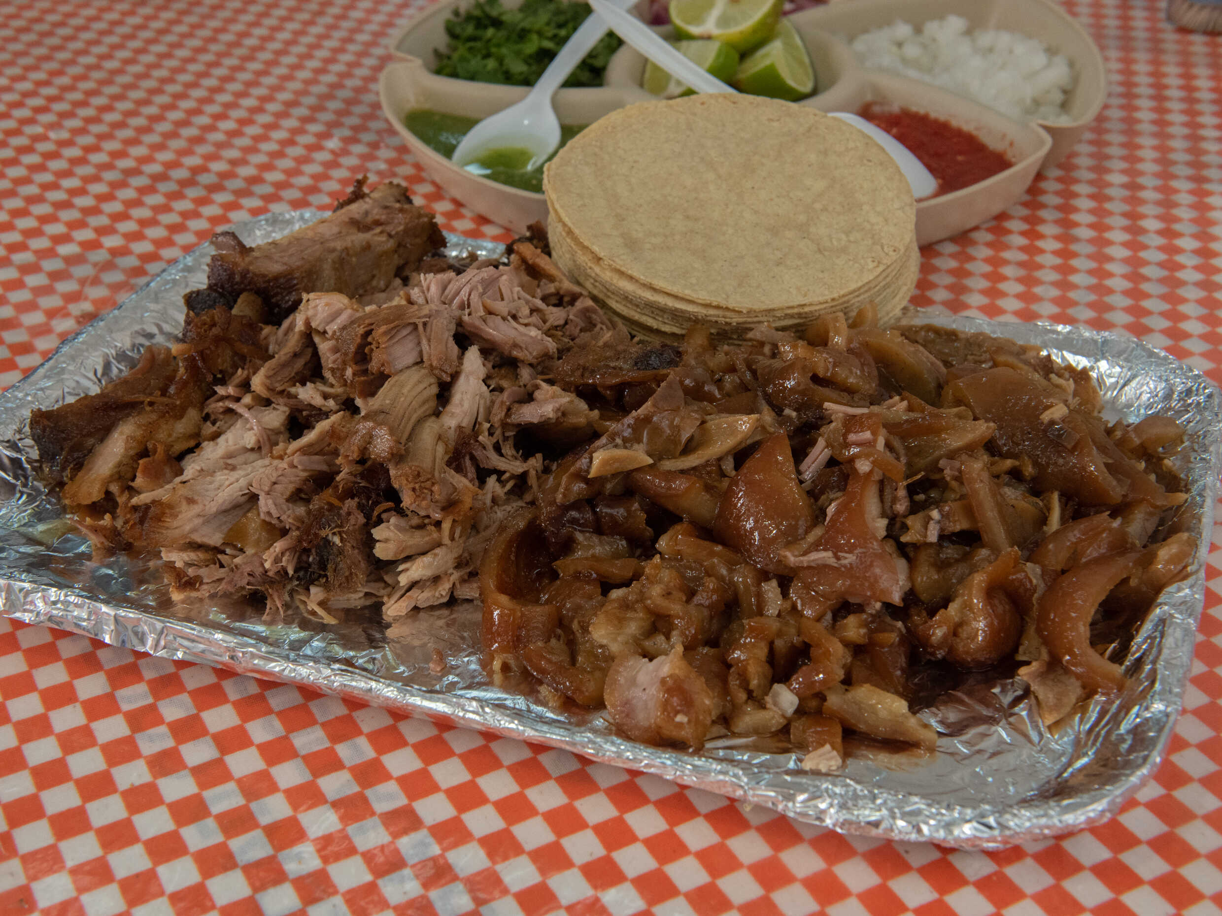 Maciza, cuerito y buche. Incluye salsa verde o roja, cebolla, cilantro, limones y cebollitas con habanero.