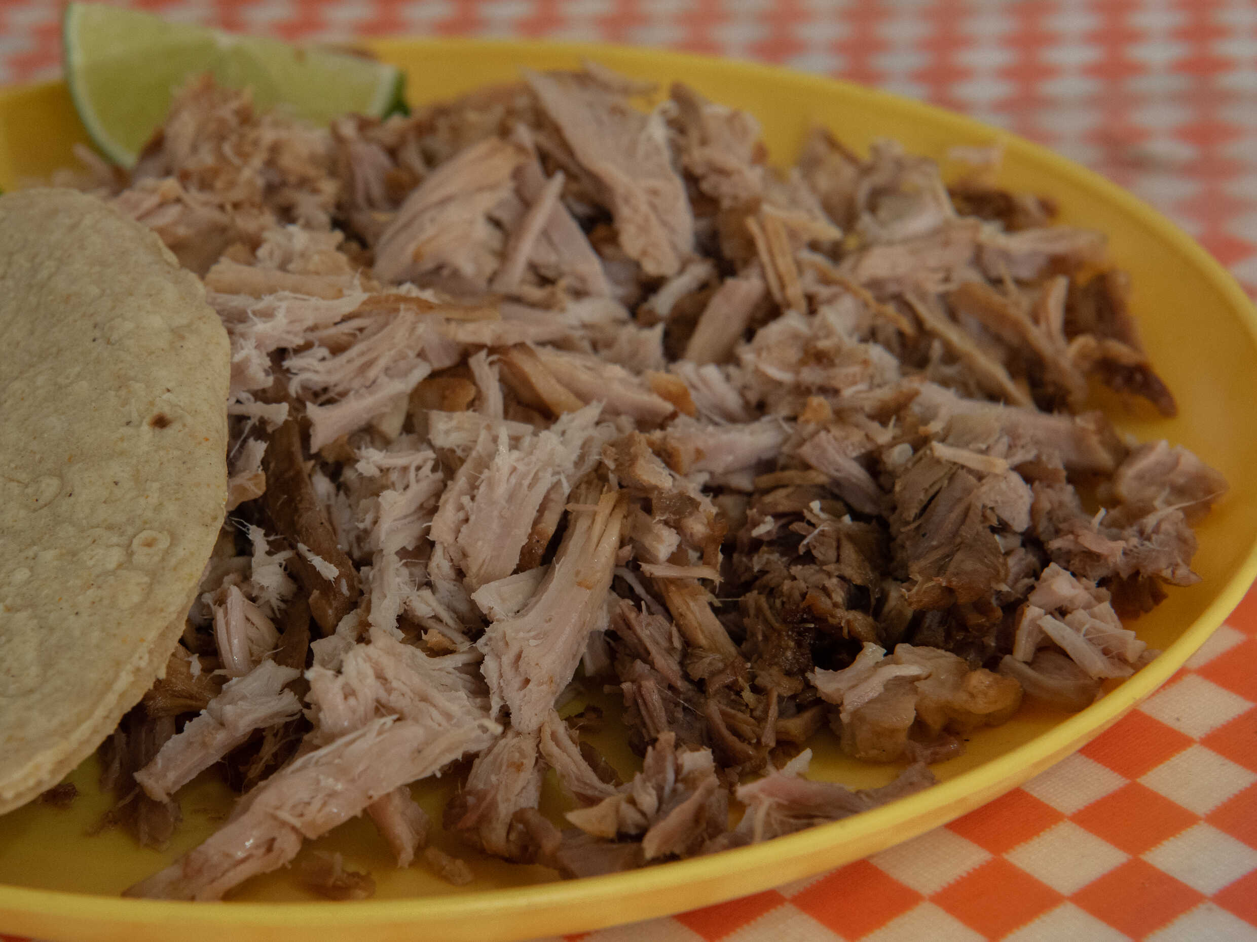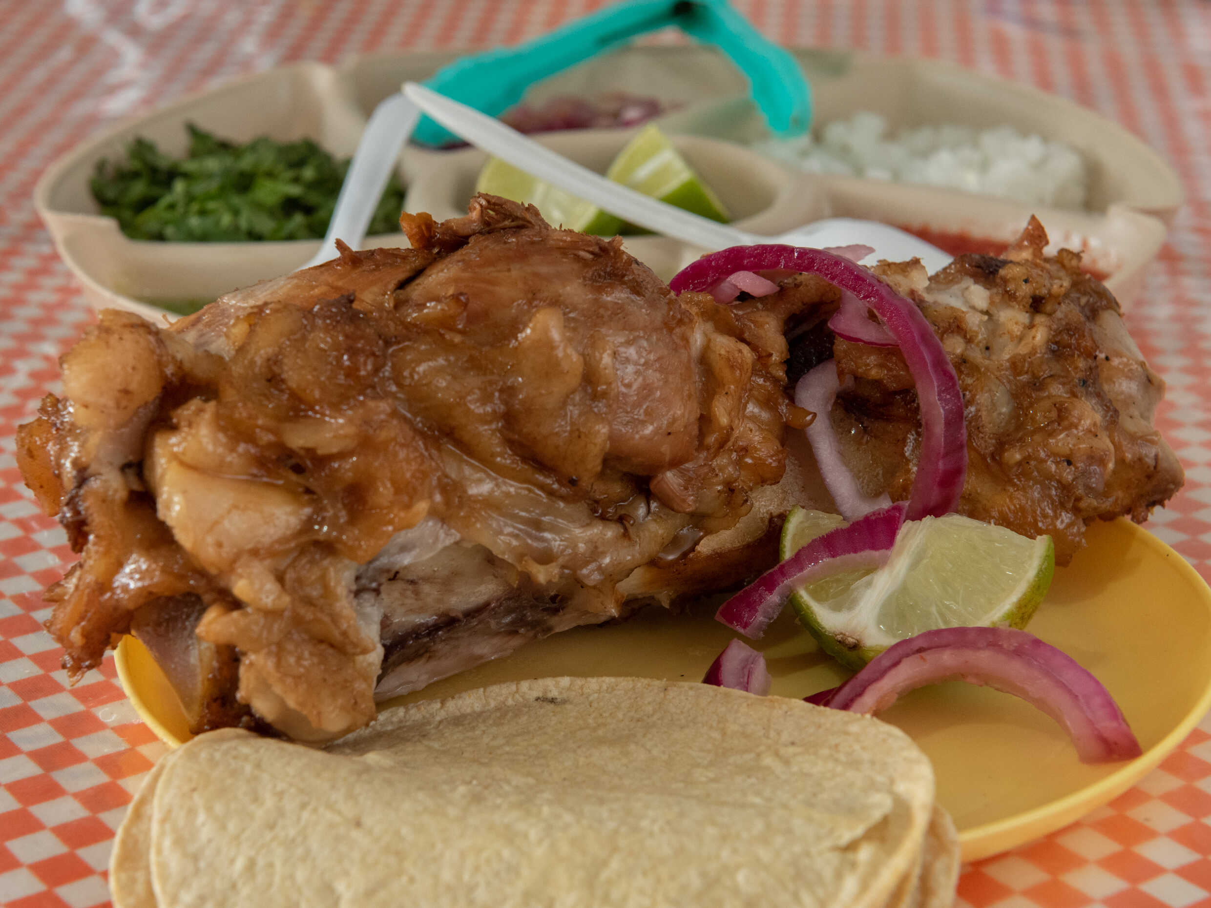 Maciza y cuerito. Incluye salsa verde o roja, cebolla, cilantro, limones y cebollitas con habanero.