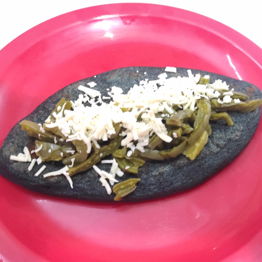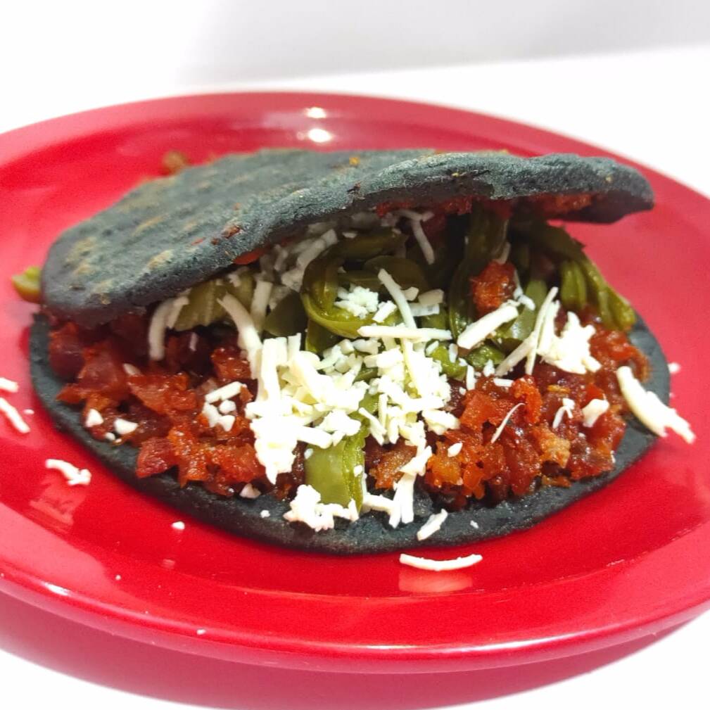 Quesadilla de masa azul de diferentes guisados, incluye el queso oaxaca.