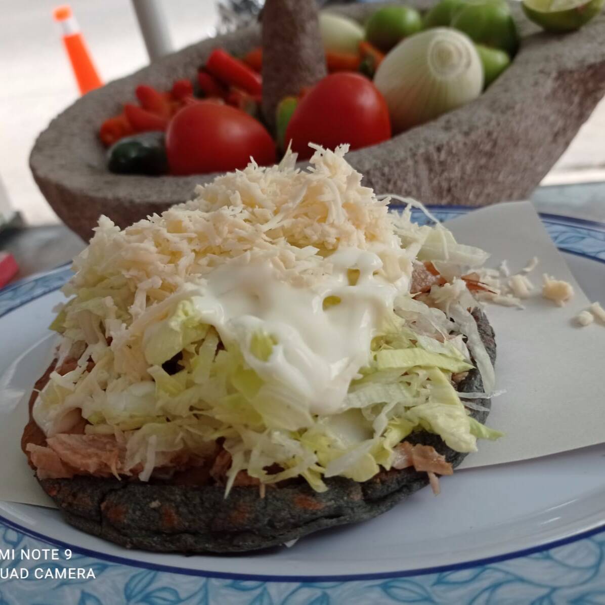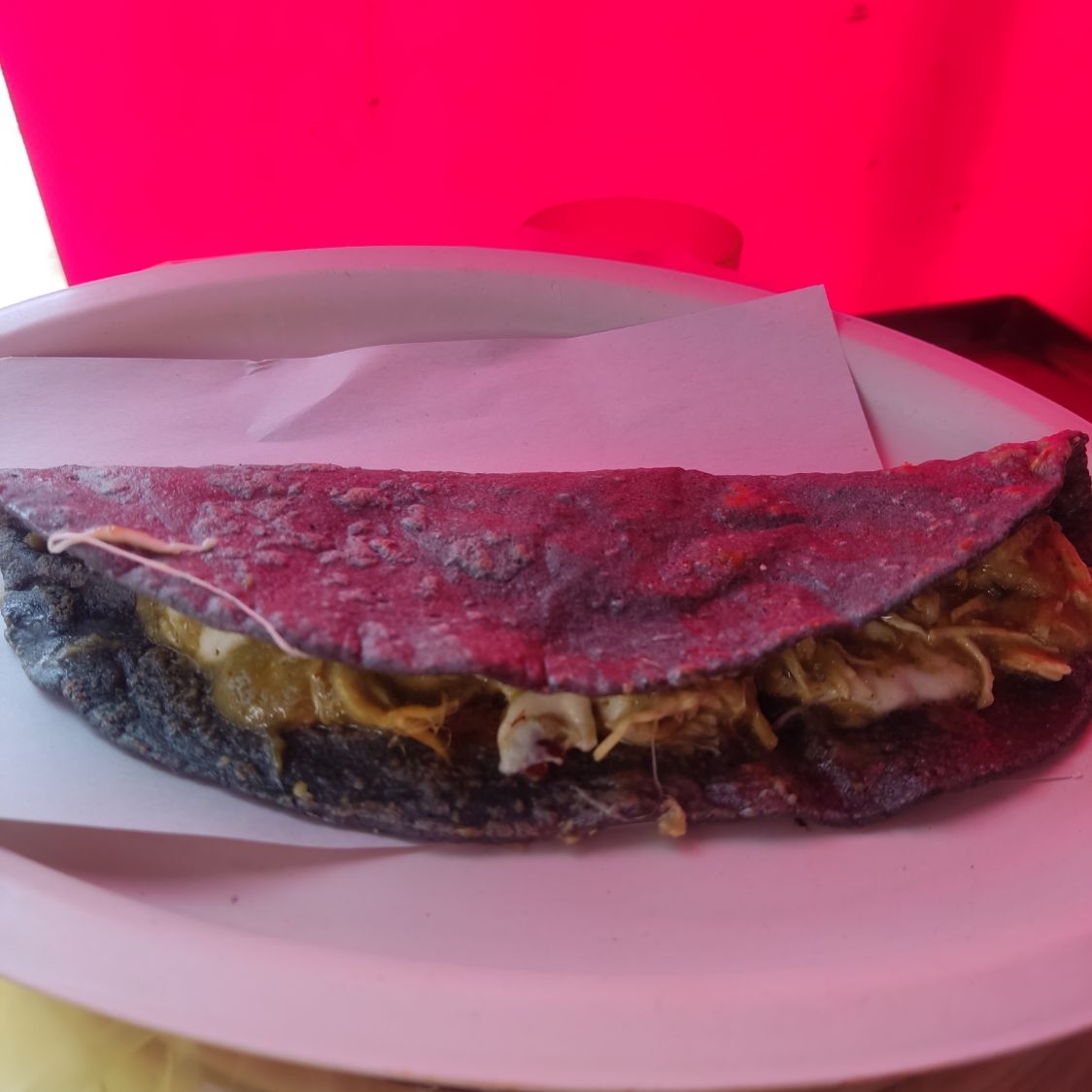 Quesadilla azul con queso oaxaca incluido de mole con carnitas bien picaditas.