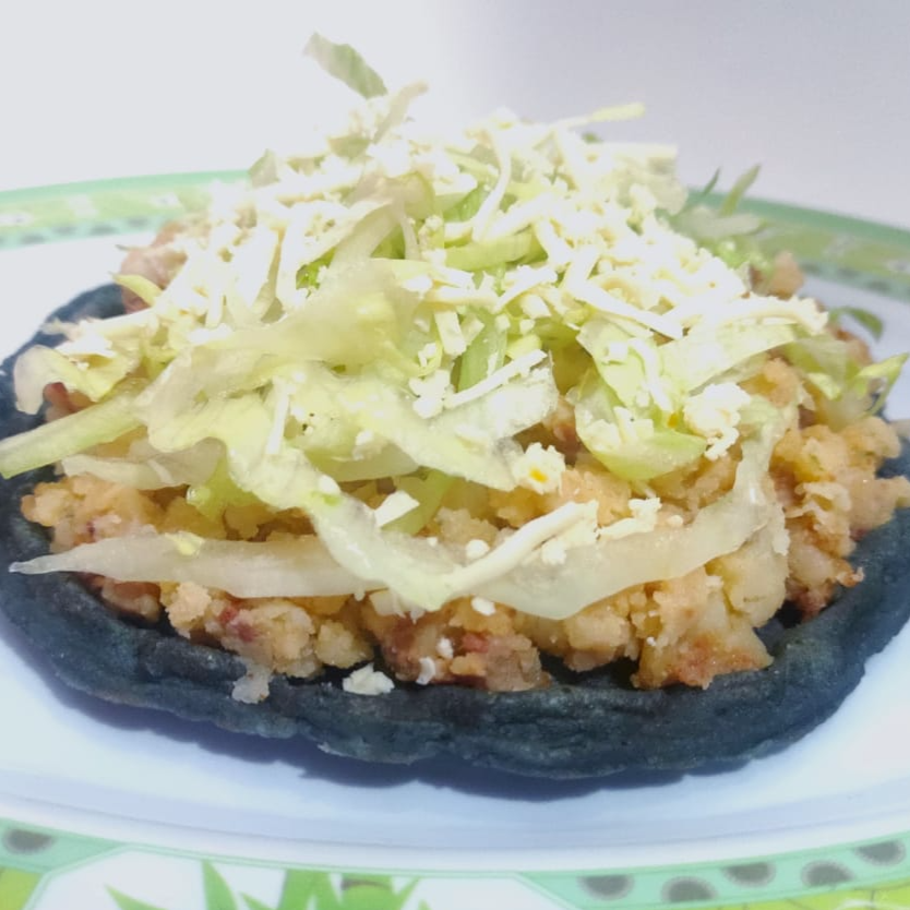 Sope de masa azul con base de frijoles y guisados de tinga, papas con chorizo y mole verde.