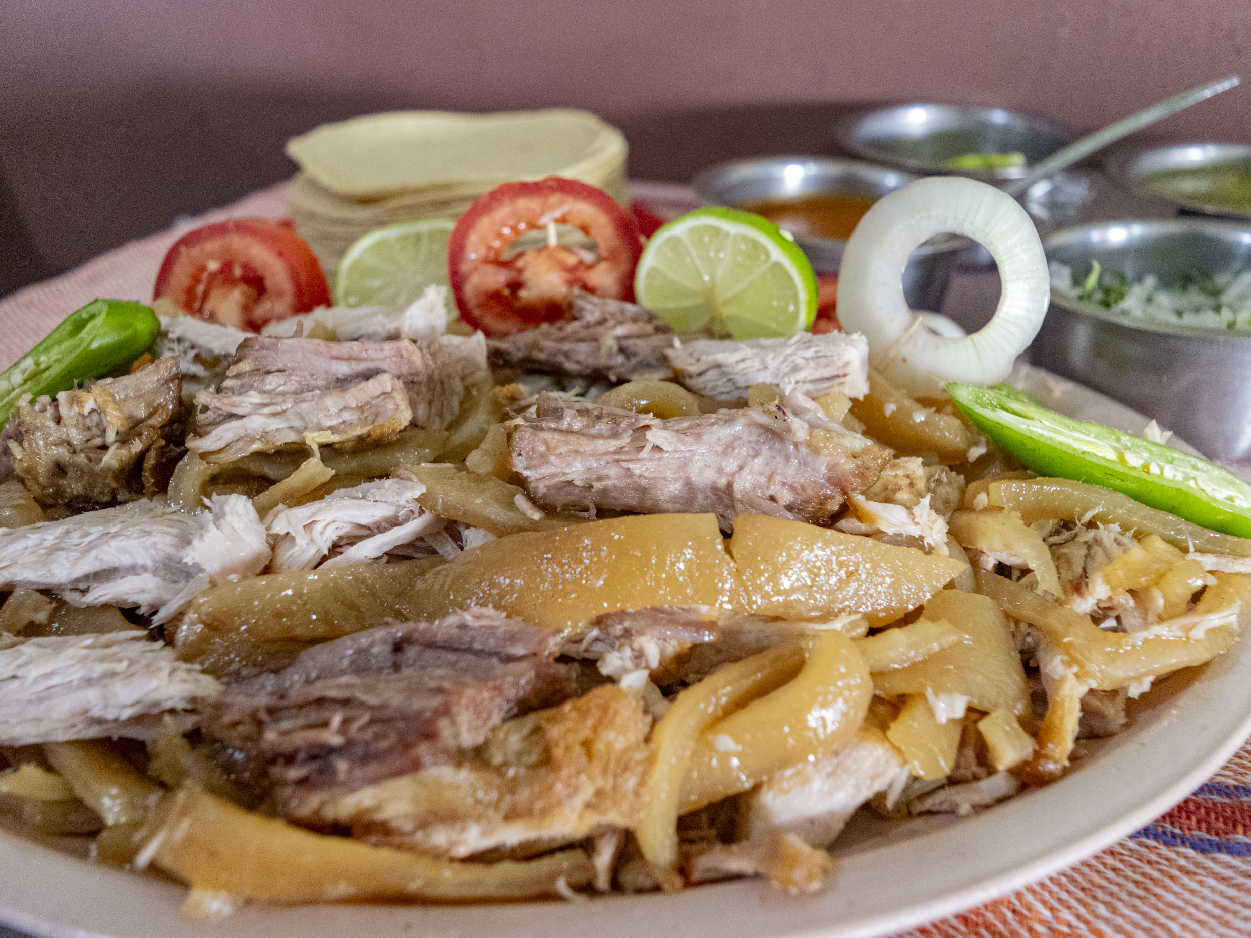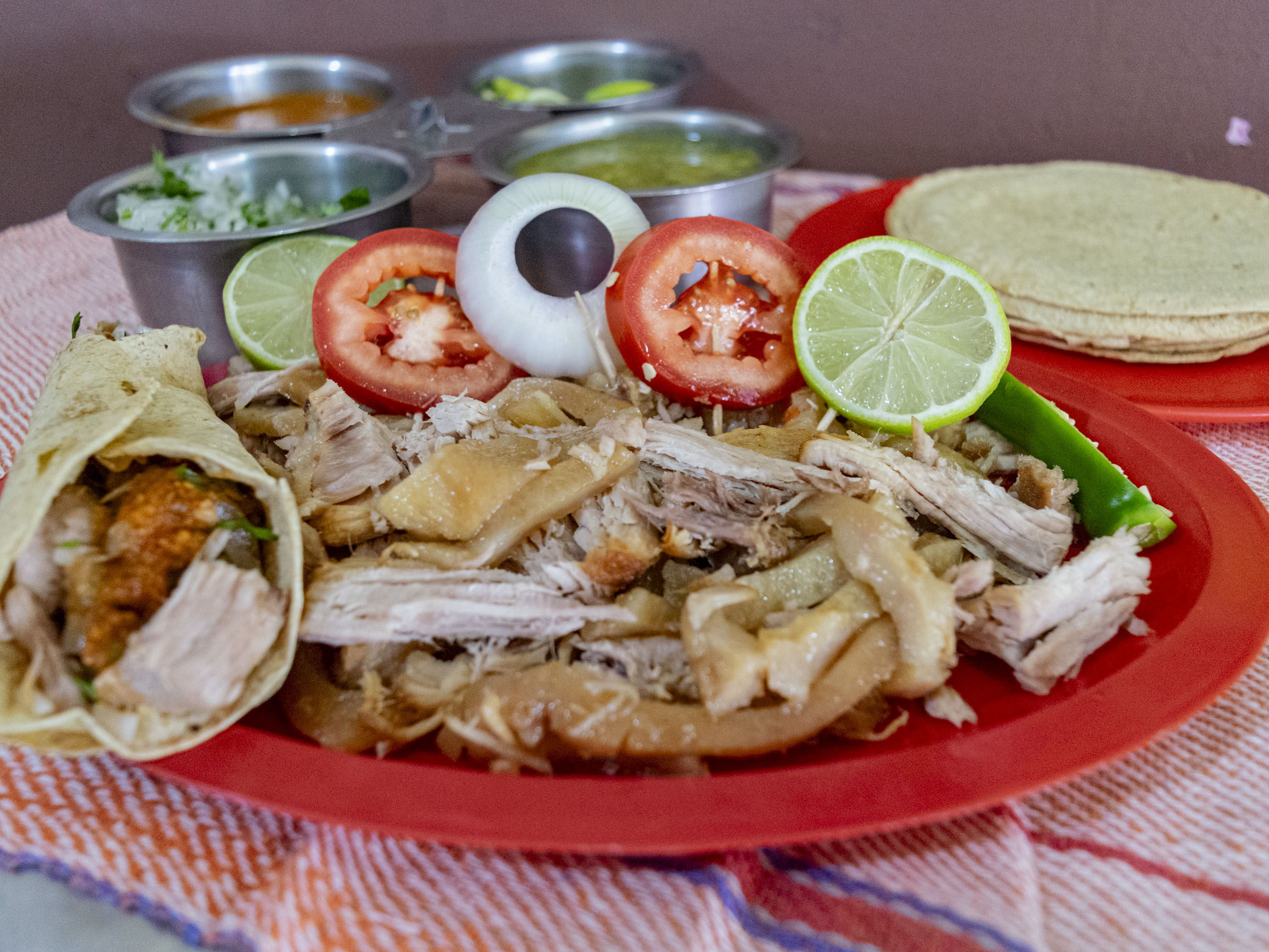 Un medio de carnitas campechano, incluye pico de gallo, salsa verde, salsa roja, limones, tortillas y servilletas.