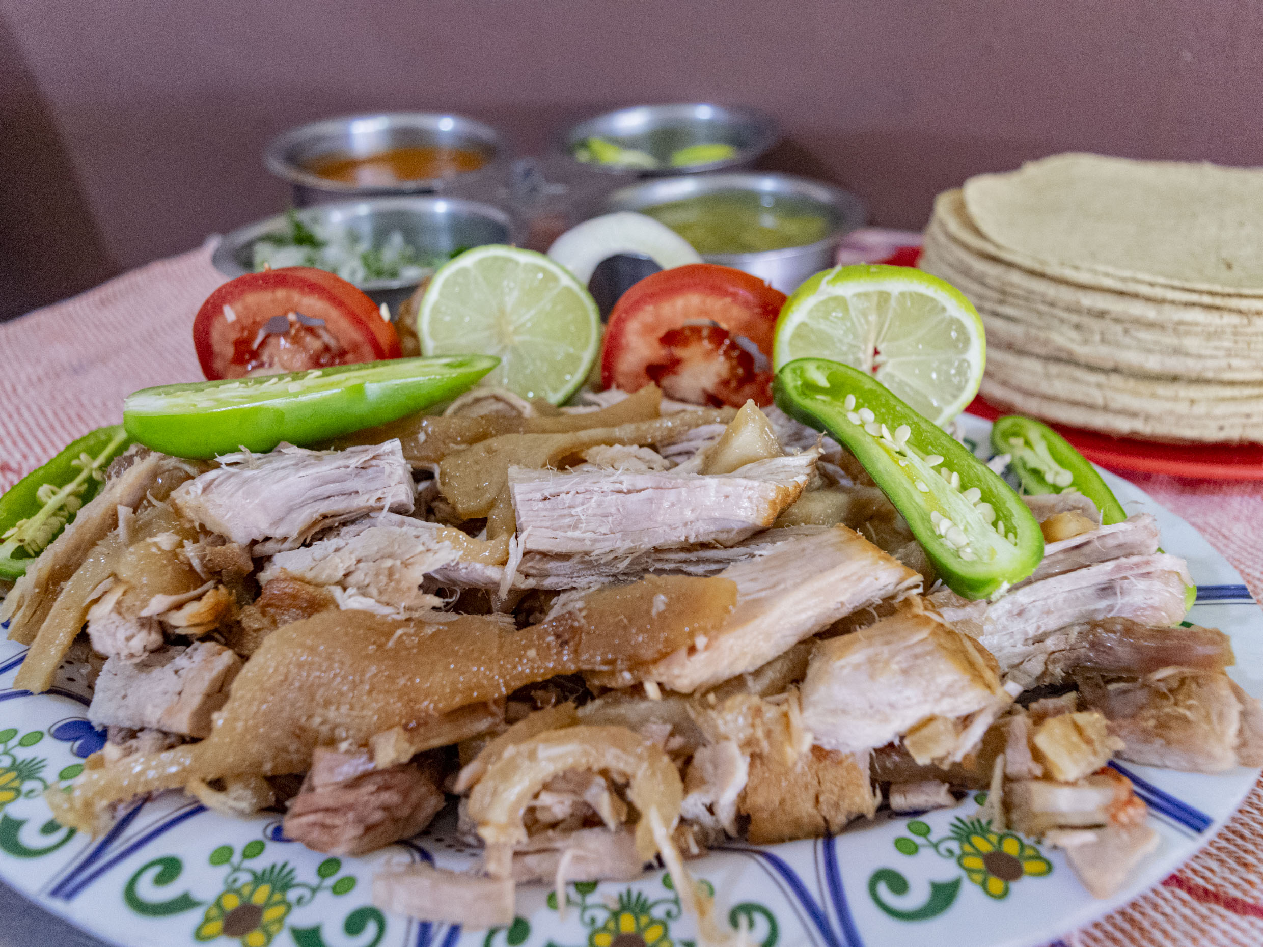 Un cuarto de carnitas campechano, incluye pico de gallo, salsa verde, salsa roja, limones, tortillas y servilletas.