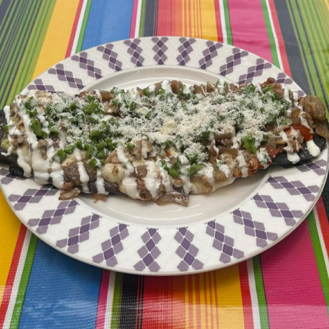 Huarache de maíz, frijoles fritos, carnitas bajo el Metodo Quiroga, queso oaxaca, nopales curados, guacamole, salsa roja, crema, queso cotija