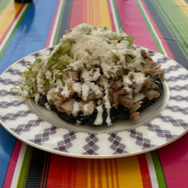Sope de maíz, frijoles fritos, carnitas bajo el Metodo Quiroga, queso cotija, crema y lechuga