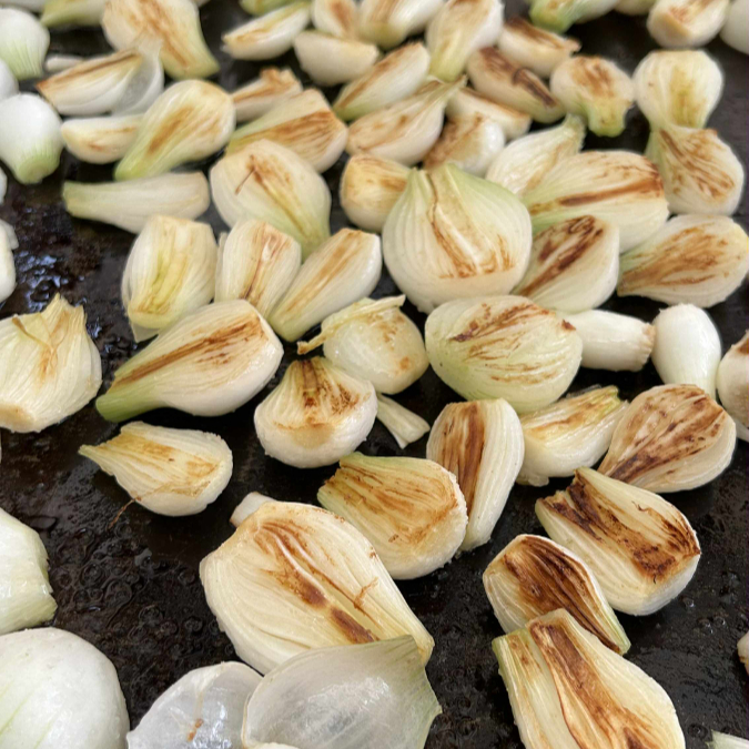 Cebollas asadas (200 gms) preparadas con limón y salsas negras.