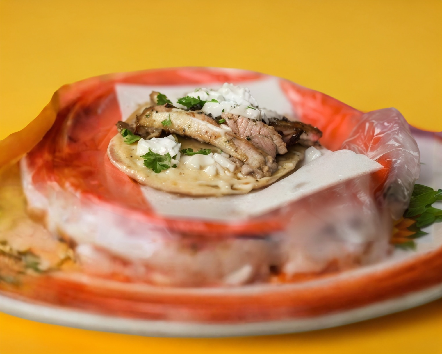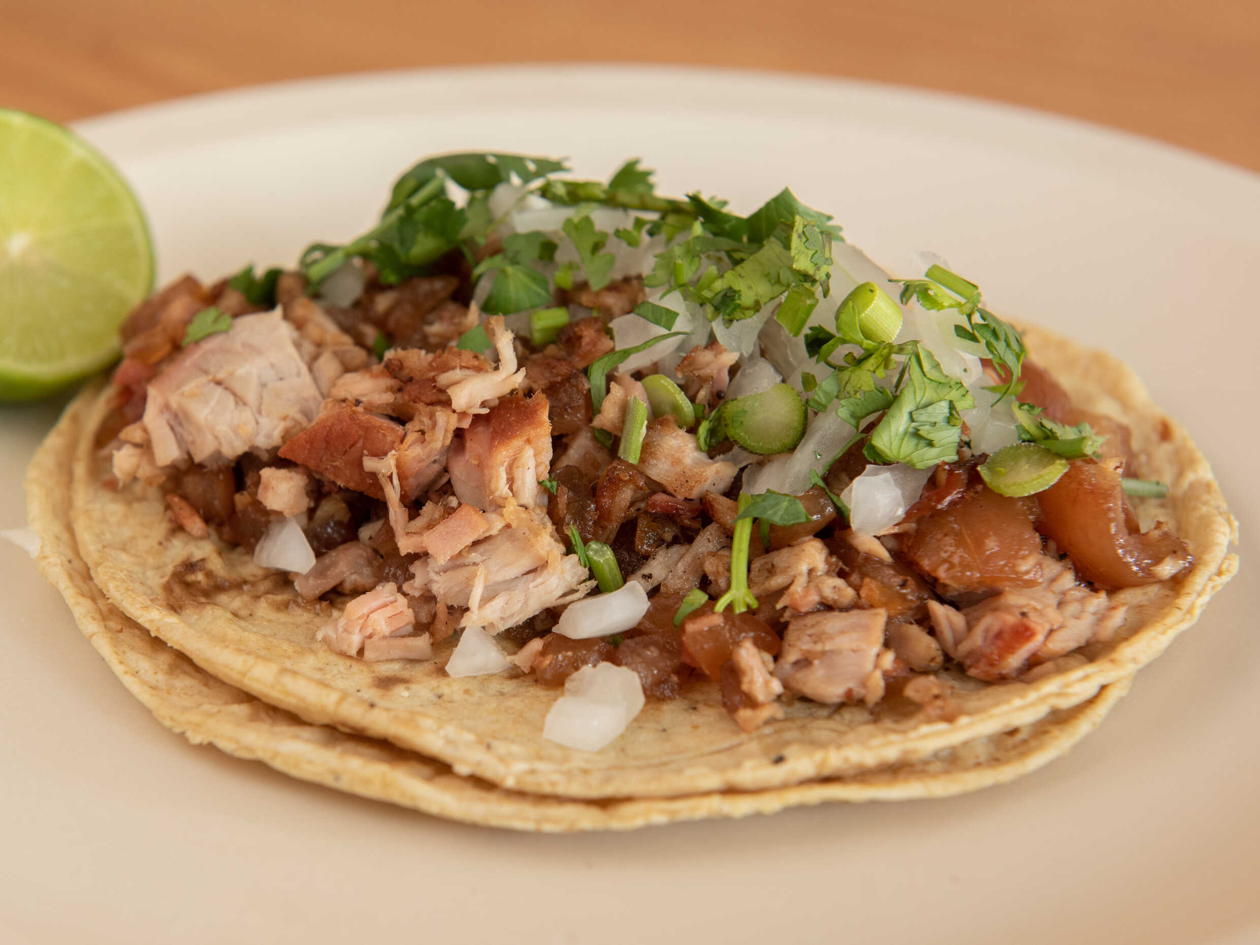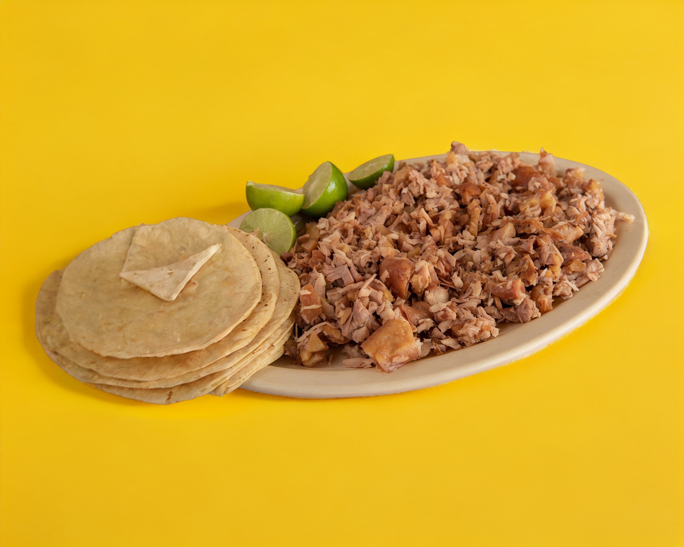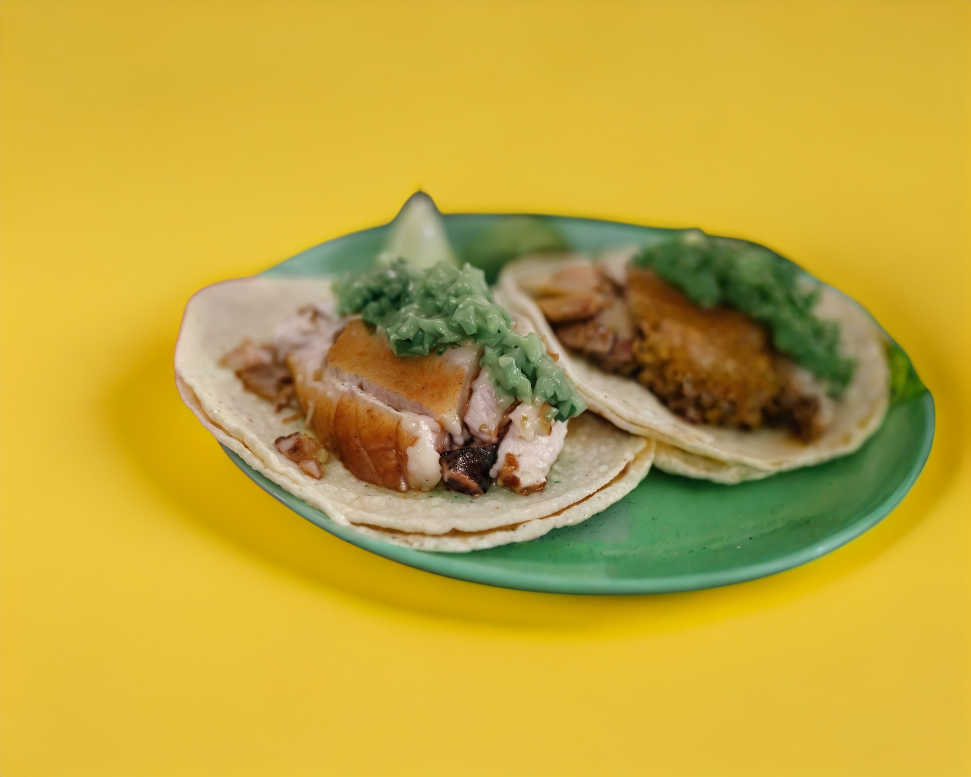 2 Tacos con mitad de maciza y mitad de cuero (60 g c/u), con salsa a elección, verdura (cebolla y cilantro) y limón por separado.