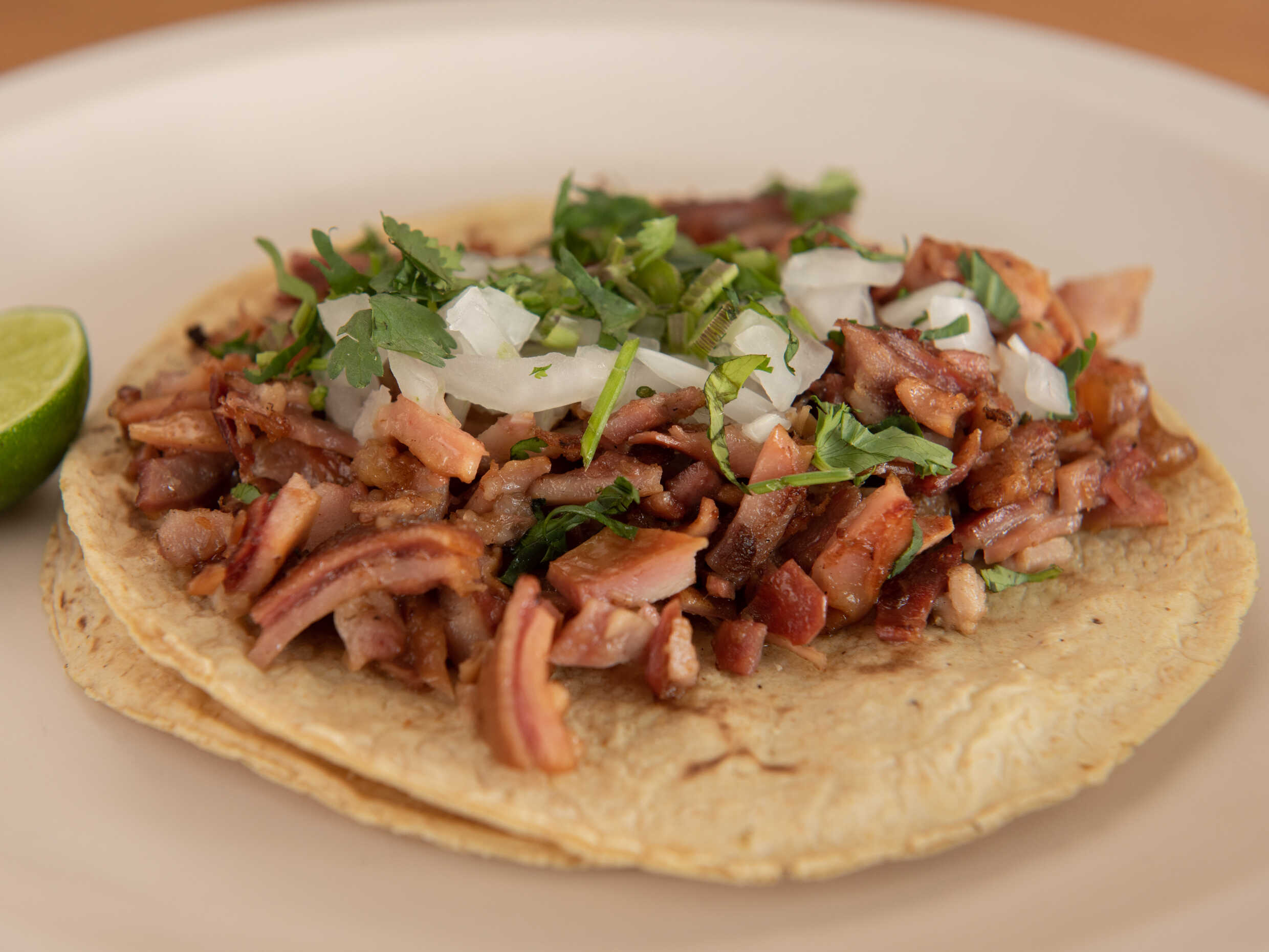 1 Taco con doble tortilla de maíz, barriga, salsa verde y verduras.